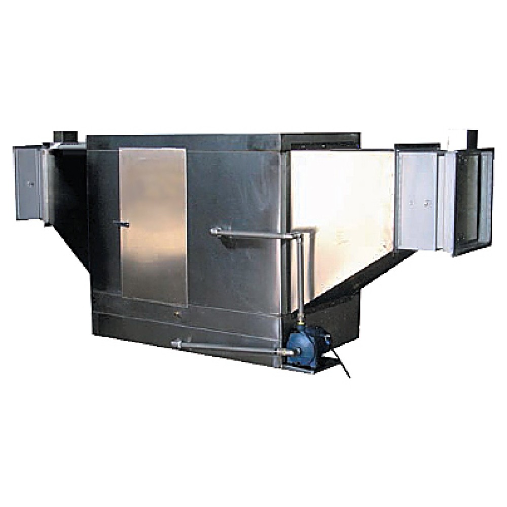 Фильтр оснащен центробежным и дополнительным дублирующим насосами. В камере предусмотрена дверь, расположенная справа по направлению движения воздушного потока и предназначенная для обслуживания, очистки и монтажа лабиринтных фильтров. Размеры входного и выходного сечения составляют 700х900 мм. Оборудование выполнено из нержавеющей стали.