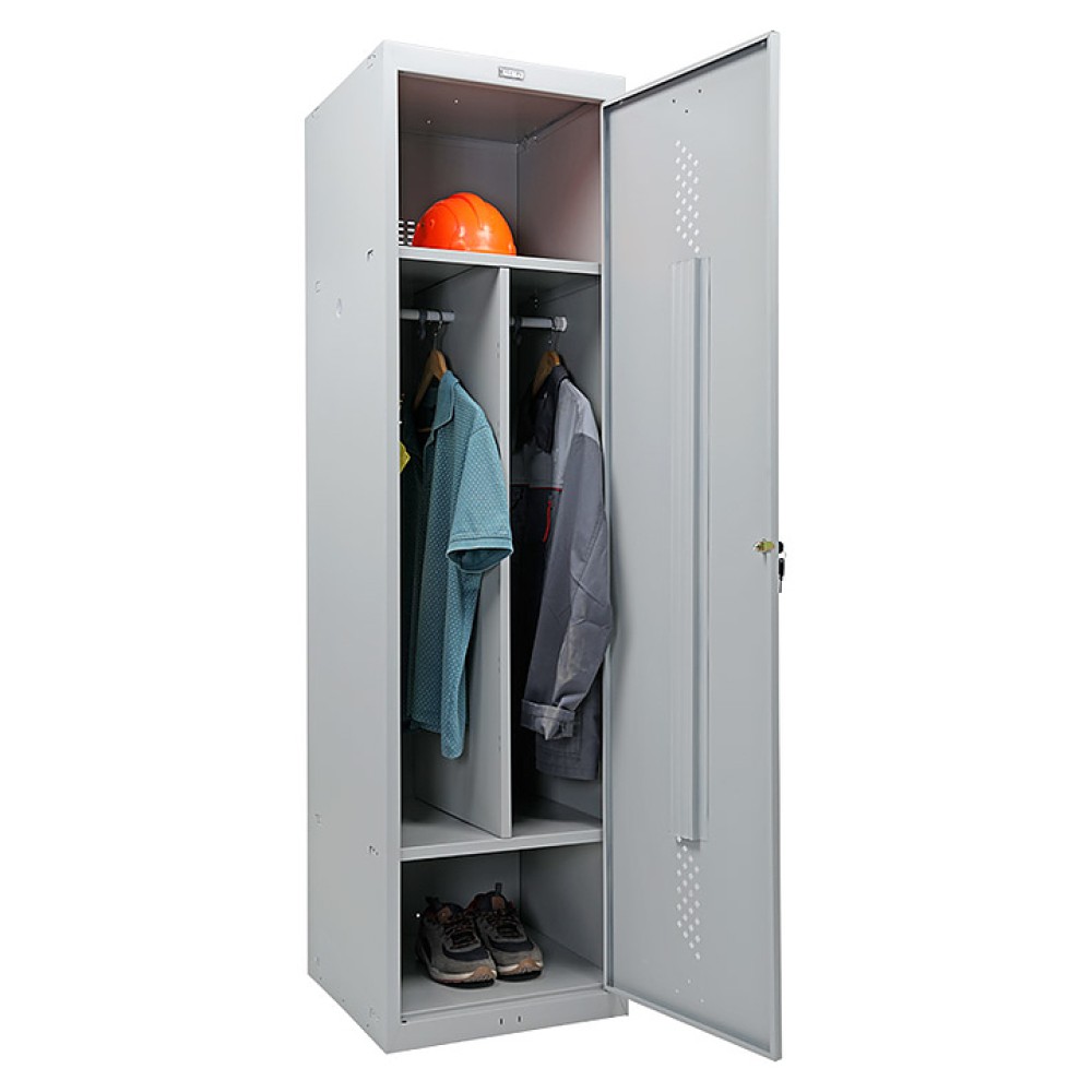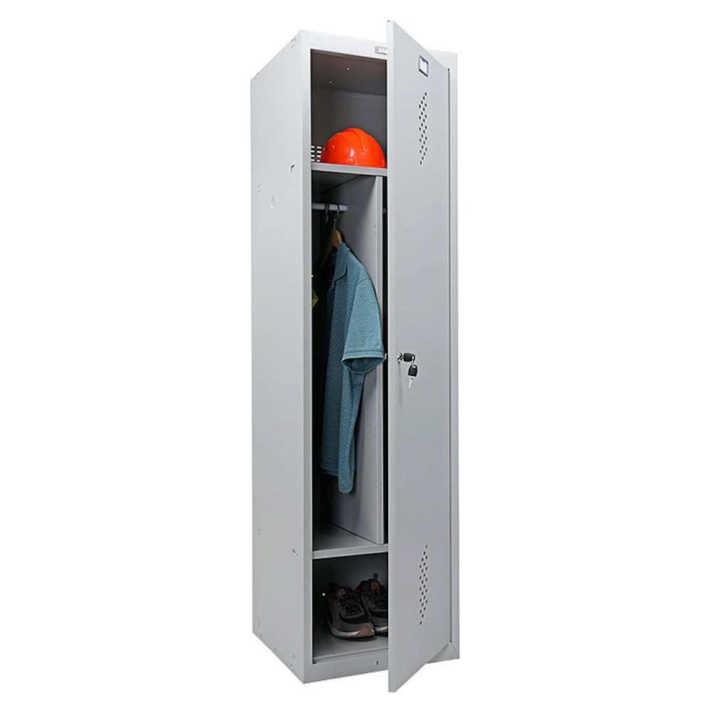 Шкаф для одежды ПРОМЕТ Практик Усиленный ML-11-50 используется на предприятиях общественного питания и торговли, а также в производственных помещениях для хранения одежды и личных вещей персонала. Модель оснащена запираемой на ключ распашной дверцей, 2 полками, перекладиной и крючками. Корпус выполнен из стали, окрашенной методом порошкового напыления.