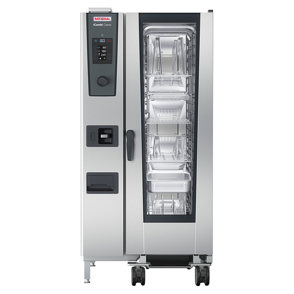 Пароконвектомат Rational iCombi Classic 20-1/1 предназначен для приготовления блюд путём жарки, тушения или варения на предприятиях общественного питания и торговли. Такое оборудование может заменить плиту, жарочный и духовой шкаф, конвекционную печь, опрокидывающуюся сковороду, пищеварочный котел и др. Модель оснащена цветным TFT-дисплеем с мягкими кнопками и поворотным регулятором с функцией Push.