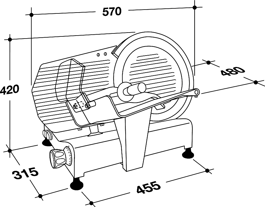 Профессиональный мотор с функцией принудительной вентиляции исключает возможность перегрева оборудования, а также делает его работу практически бесшумной. Слайсер оснащен фиксированным устройством для заточки ножа с двойным наждаком. Поддон для продуктов, перемычка для регулирования толщины среза, кольцо, покрывающее лезвие, и держатель продуктов выполнены из алюминия, отполированного путем анодирования, что обеспечивает их гигиеническую чистоту и защиту от коррозии.