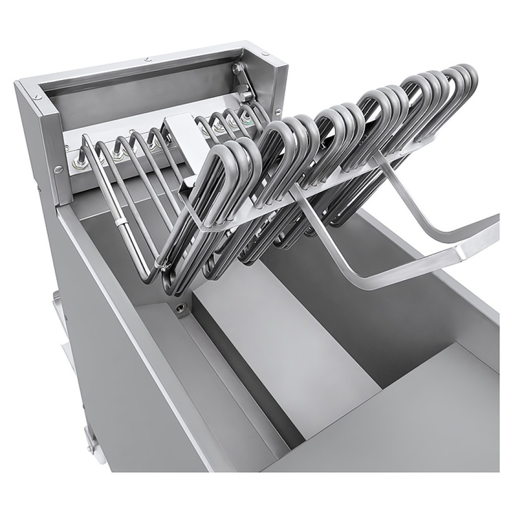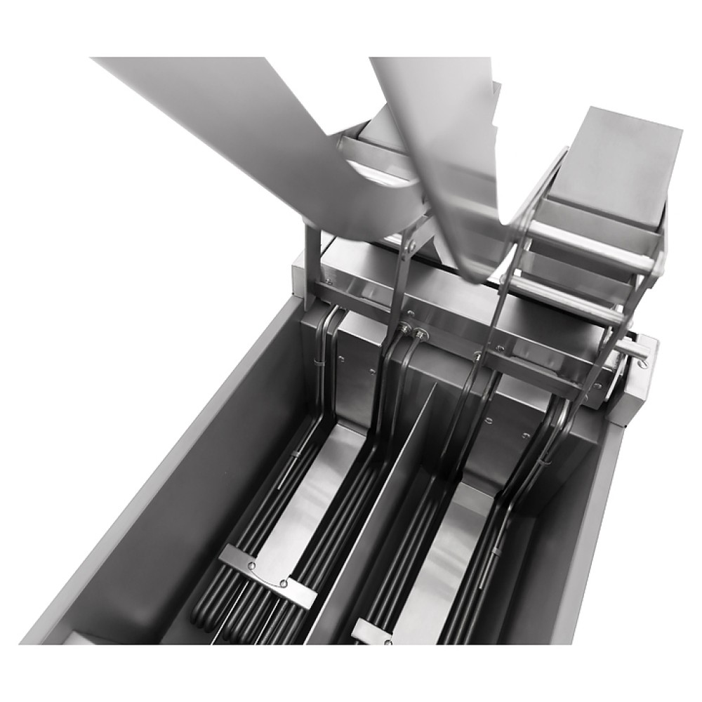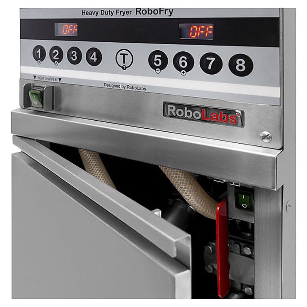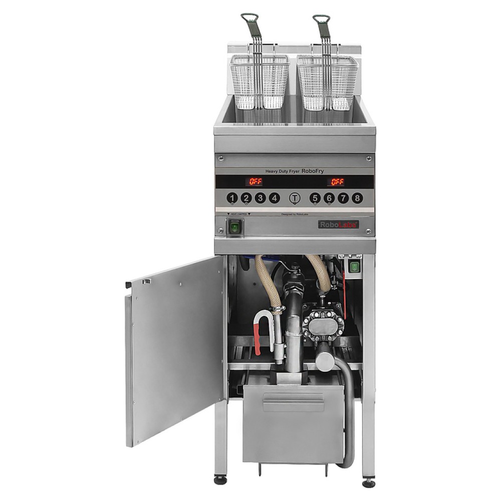 Фритюрница RoboLabs RoboFry RF2 предназначена для приготовления различных продуктов в большом количестве масла на предприятиях общественного питания и торговли. Модель оснащена электронной программируемой панелью управления, ручным механизмом поднятия ТЭНов, системой фильтрации масла и закрытой подставкой. Конструкция изготовлена из нержавеющей стали AISI 430.