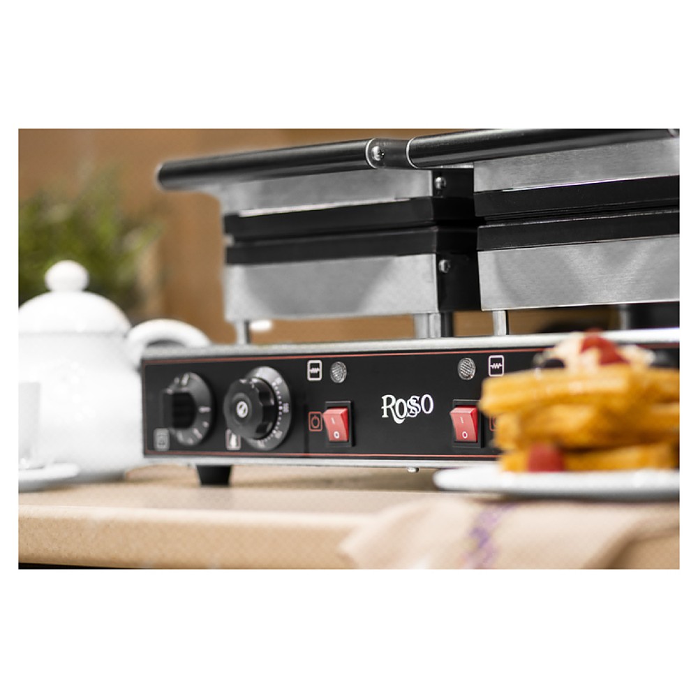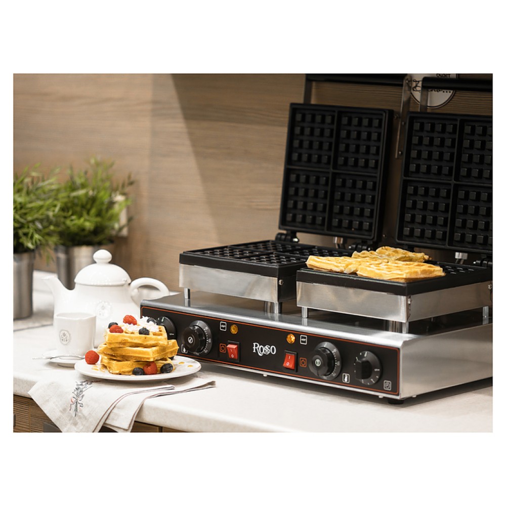 Вафельница Rosso HWB-2S используется на предприятиях общественного питания и торговли для выпекания прямоугольных бельгийских вафель. Материал корпуса: нержавеющая сталь, материал жарочной поверхности: литой алюминий с антипригарным покрытием.
