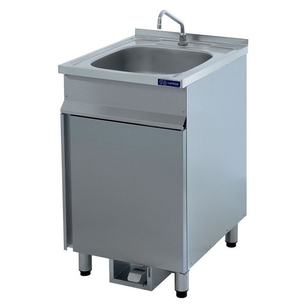 Напольный рукомойник KAYMAN РМНЗ-500/600-П-А используется на предприятиях общественного питания и торговли. Модель оснащена ножной педалью и регулируемыми по высоте ножками. Корпус и цельнотянутая ванна выполнены из нержавеющей стали AISI 304, боковые стенки и дверца тумбы - из нержавеющей стали AISI 430, задняя стенка тумбы - из оцинкованной стали.