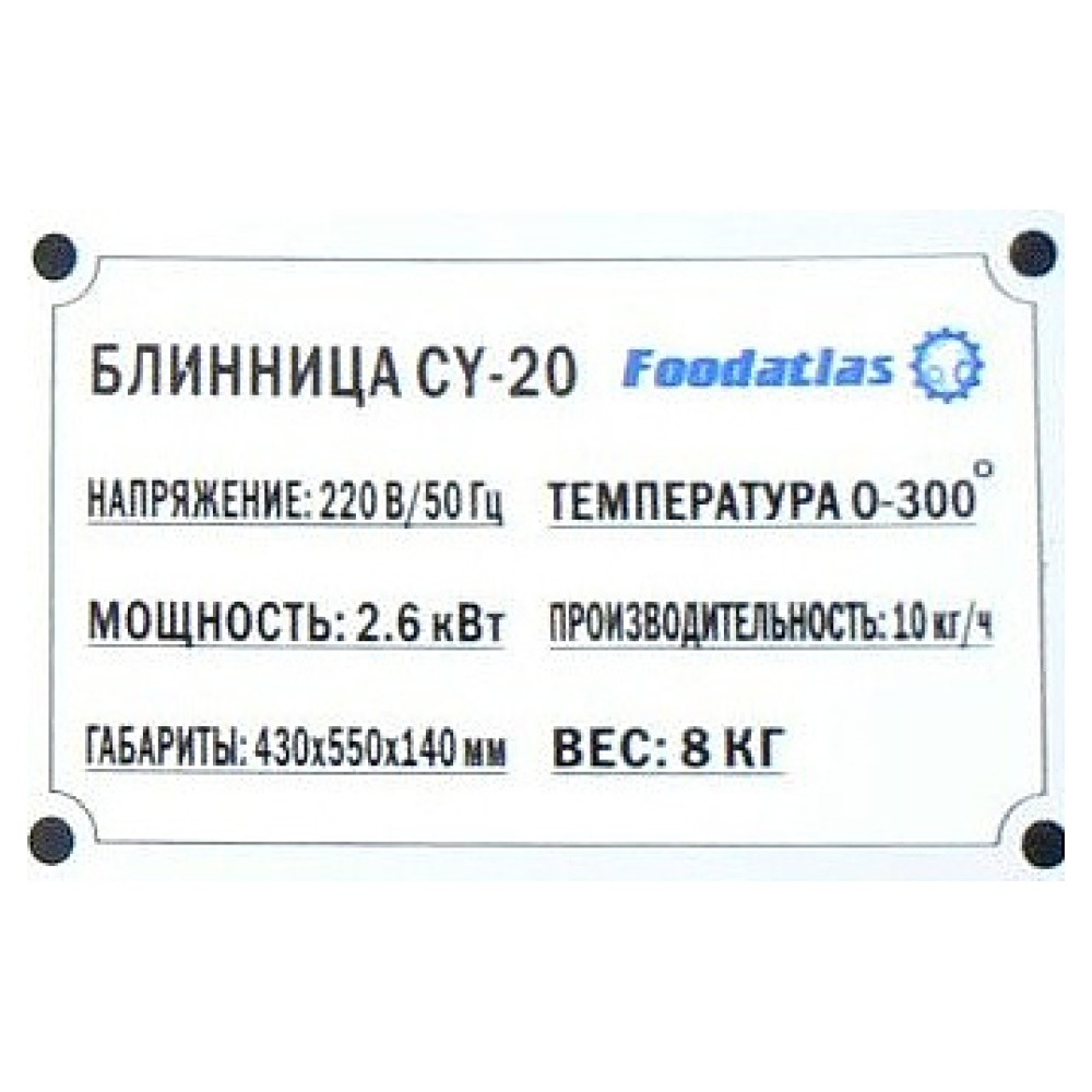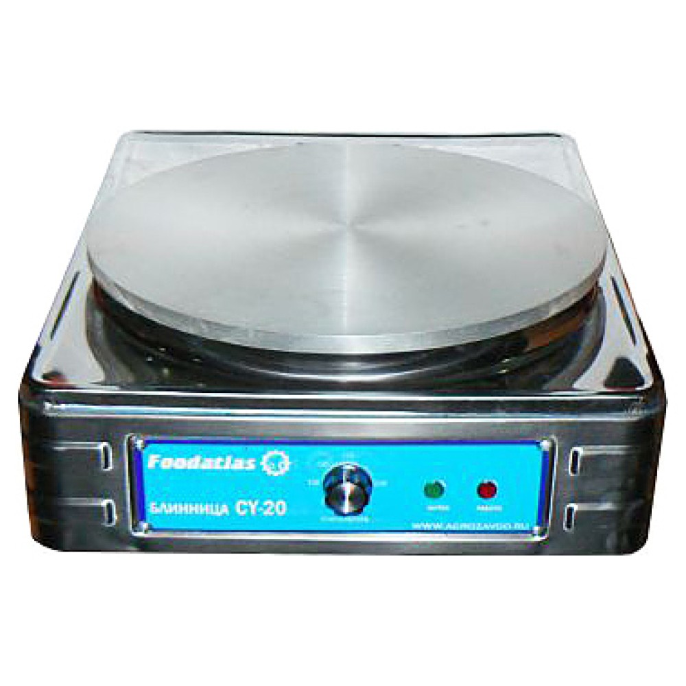 Блинница Foodatlas CY-20 используется на предприятиях общественного питания и торговли. Модель оснащена терморегулятором. Корпус выполнен из нержавеющей стали 430, конфорка - из алюминия.