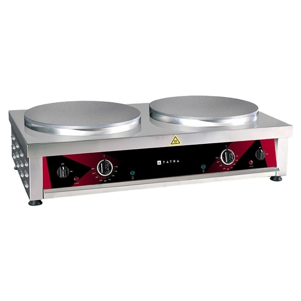 Блинница Tatra TCM S 40 D предназначена для выпечки блинов на предприятиях общественного питания и торговли. Модель оснащена электромеханической панелью управления с терморегулятором, системой независимого управления жарочными поверхностями и индикаторами питания и нагрева. Корпус выполнен из нержавеющей стали, жарочные поверхности имеют тефлоновое покрытие.