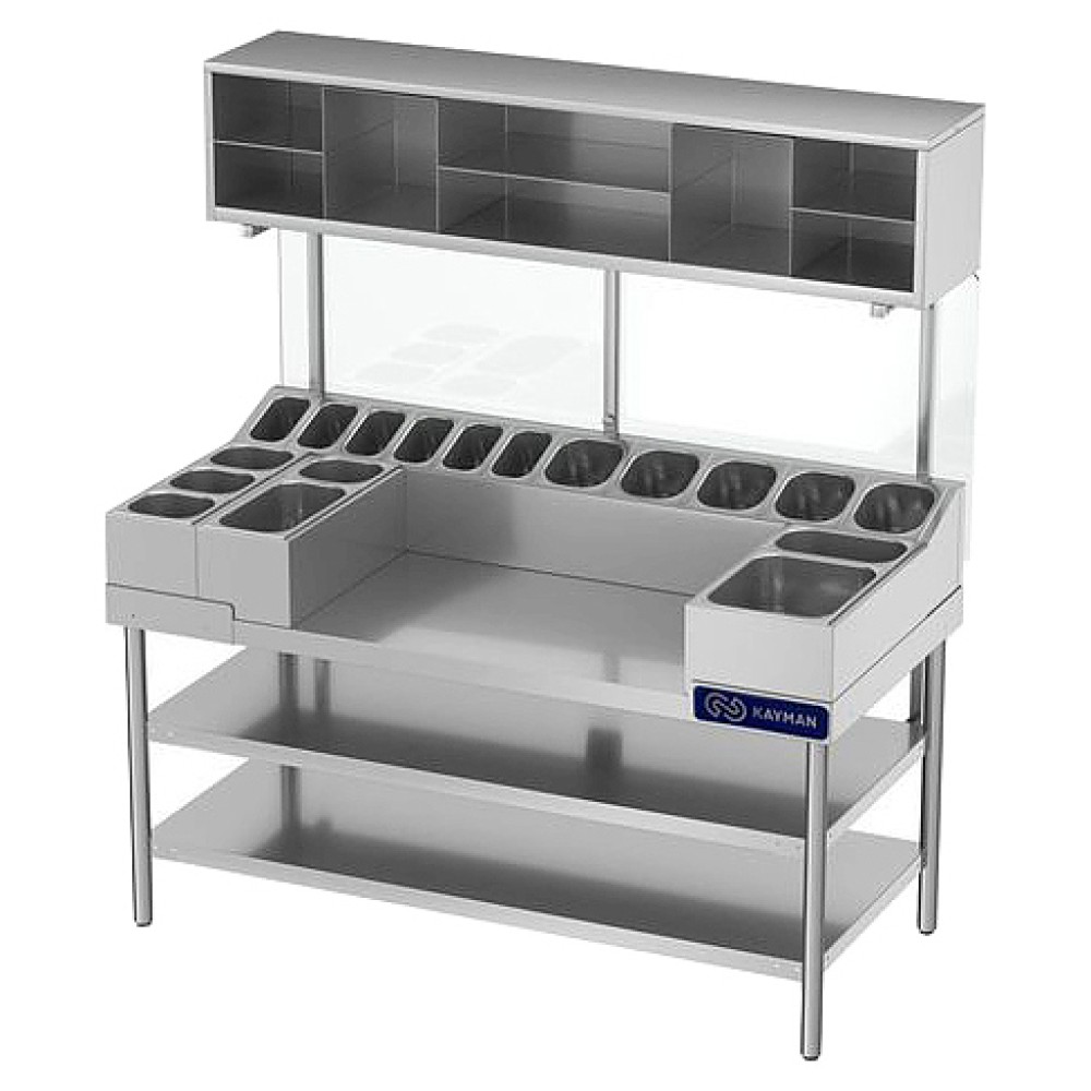 Блинная станция KAYMAN СП-Б-1500 А предназначена для комплексного оснащения рабочего места приготовления и раздачи блинов с начинкой на предприятиях общественного питания и торговли. Модель оснащена съемными холдерами для размещения гастроемкостей под тесто и начинки и пространством для установки электрической блинницы БЭ-2-360 А или газовой блинницы БГ-2-360 А. Стойки каркаса выполнены из трубы 40 мм нержавеющей стали, все остальные конструктивные элементы - из нержавеющей стали.
