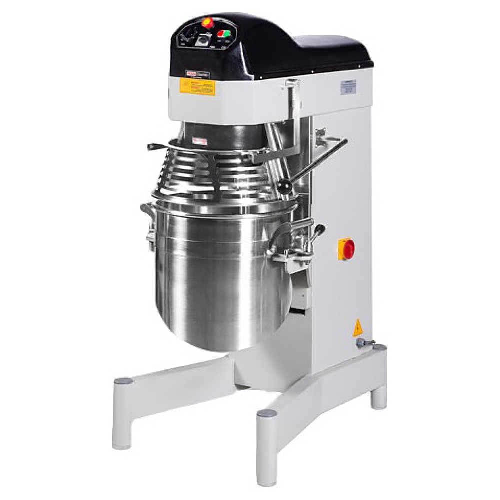 Планетарный миксер SGS PM 40 используется на предприятиях пищевой промышленности, общественного питания и торговли для замеса теста при производстве хлебобулочных и кондитерских изделий, а также приготовления суфле, кремов и соусов. Модель оснащена 3-скоростным двигателем с ременным приводом и электромеханической панелью управления. Корпус выполнен из окрашенного металла, дежа и насадки – из нержавеющей стали марки AISI 304.