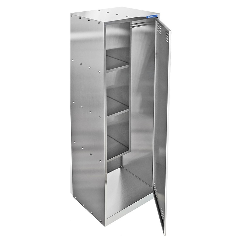 Шкаф для одежды KAYMAN ШР-23Н/0504 используется на предприятиях общественного питания и торговли, а также в промышленно-производственных заведениях для хранения хозяйственного инвентаря. Модель оснащена 3 полками, 2 из которых регулируются по высоте, перекладиной. Сварной каркас выполнен из стали AISI 430.