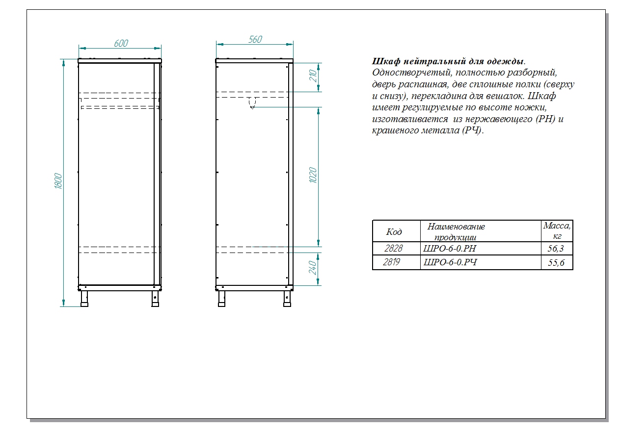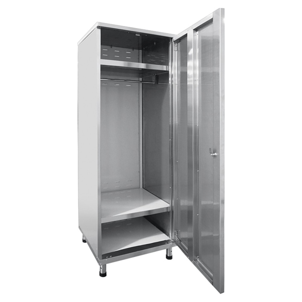 Шкаф для одежды Abat ШРО-6-0 используется на предприятиях общественного питания и торговли для хранения личных вещей персонала. Модель оснащена 2 сплошными полками, перекладиной для вешалки и регулируемыми по высоте ножками.