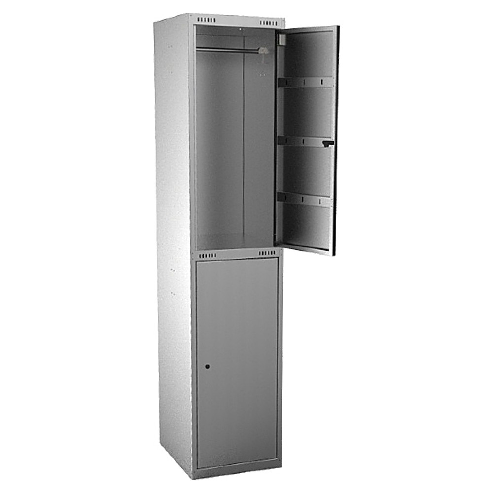 Гардеробный 2-х секционный шкаф Кобор ШГ-60/50 предназначен для хранения вещей на предприятиях общественного питания и торговли. Модель оснащена 2 дверями, 2 перекладинами, 4 крючками и 2 замками. Каркас выполнен из нержавеющей стали AISI 430.
