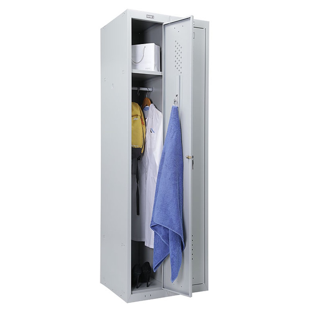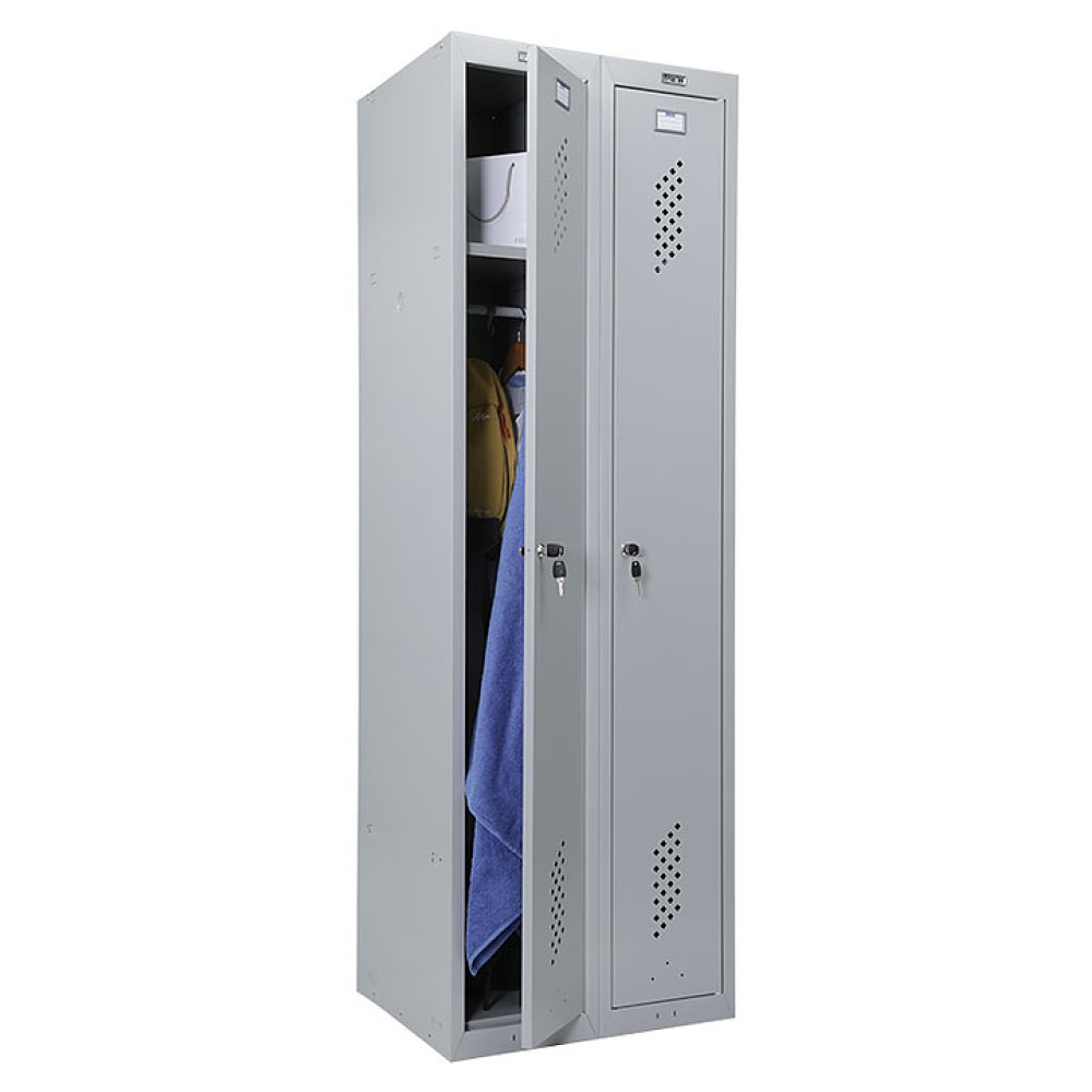 Шкаф для одежды ПРОМЕТ Практик Усиленный ML-21-60 используется на предприятиях общественного питания и торговли, а также в производственных помещениях для хранения одежды и личных вещей персонала. Модель имеет 2 секции, каждая из которых оснащена запираемой на ключ распашной дверцей, полкой, перекладиной и крючками. Корпус выполнен из стали, окрашенной методом порошкового напыления.
