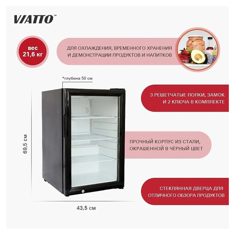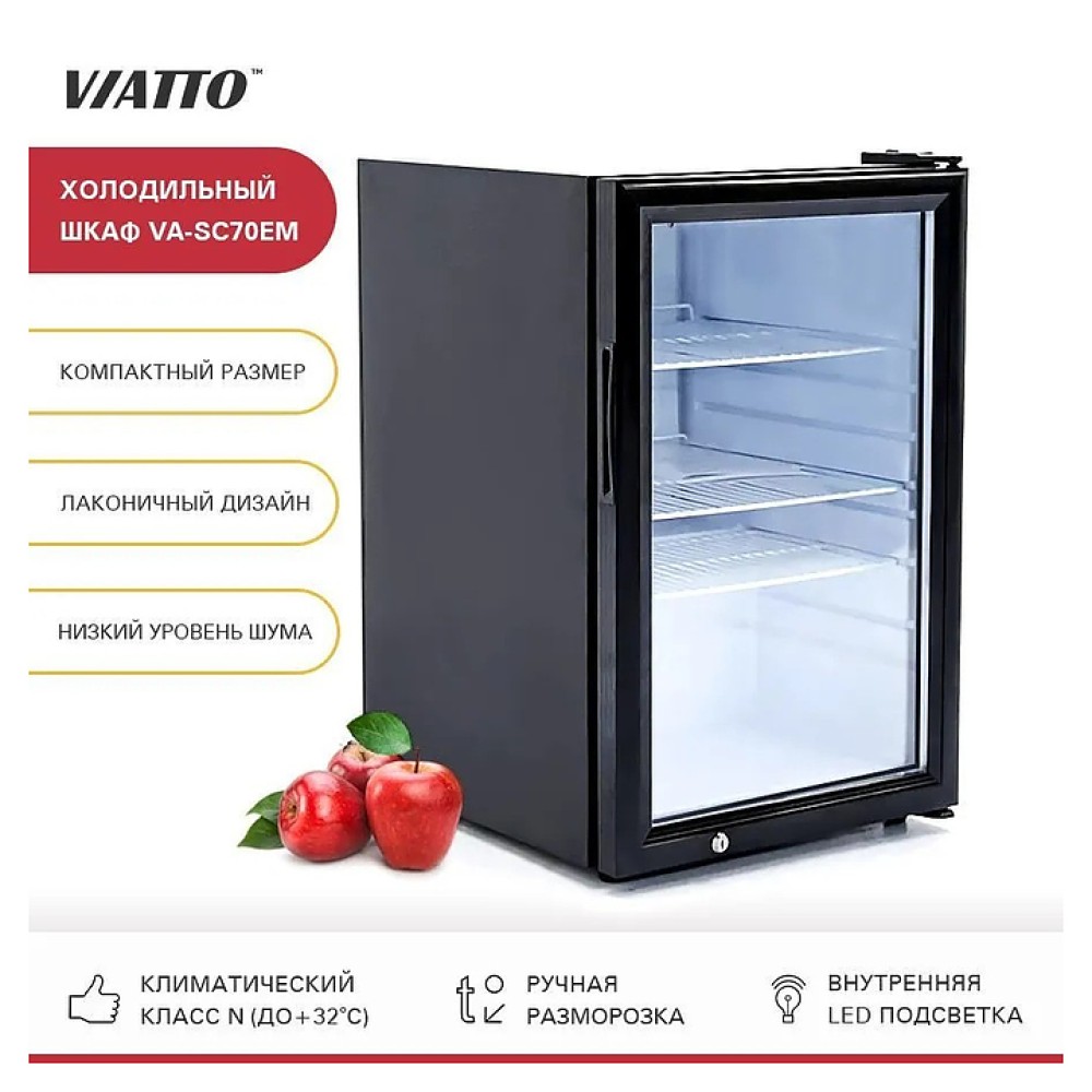 Холодильный шкаф VIATTO VA-SC70EM предназначен для охлаждения, временного хранения и демонстрации продуктов и напитков на предприятиях общественного питания и торговли. Модель оснащена распашной, стеклянной дверцей и рамой из нержавеющей стали и 3 решетчатыми полками. Корпус выполнен из окрашенной стали, внутренняя камера- из пластика.