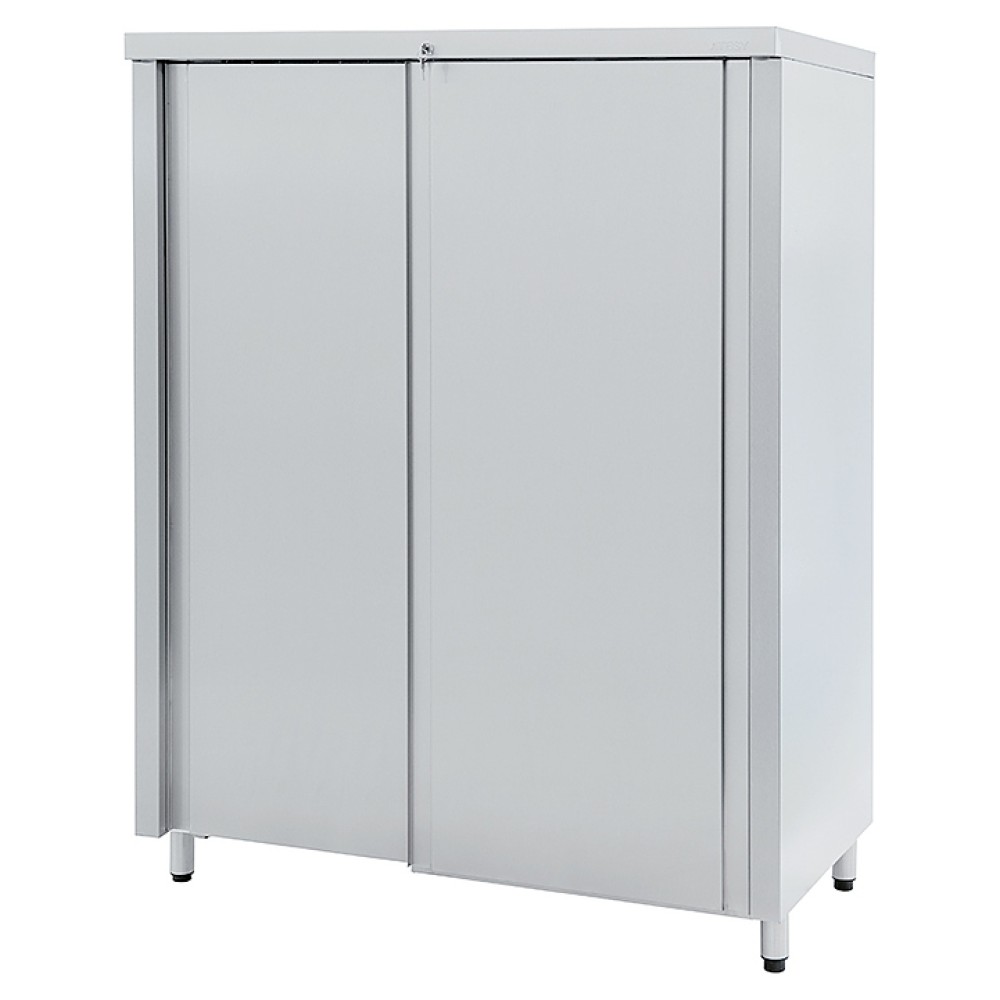 Кухонный шкаф ATESY ШЗК-С-1400.600-02-К серии Стандарт используется на предприятиях общественного питания и торговли для хранения столовой и кухонной посуды и инвентаря, а также продуктов питания, не требующих особых условий хранения. Модель оснащена дверями-купе с замком. Дно и задняя стенка выполнены из оцинкованной стали, остальные детали - из нержавеющей стали AISI 430 толщиной 0,8 мм.