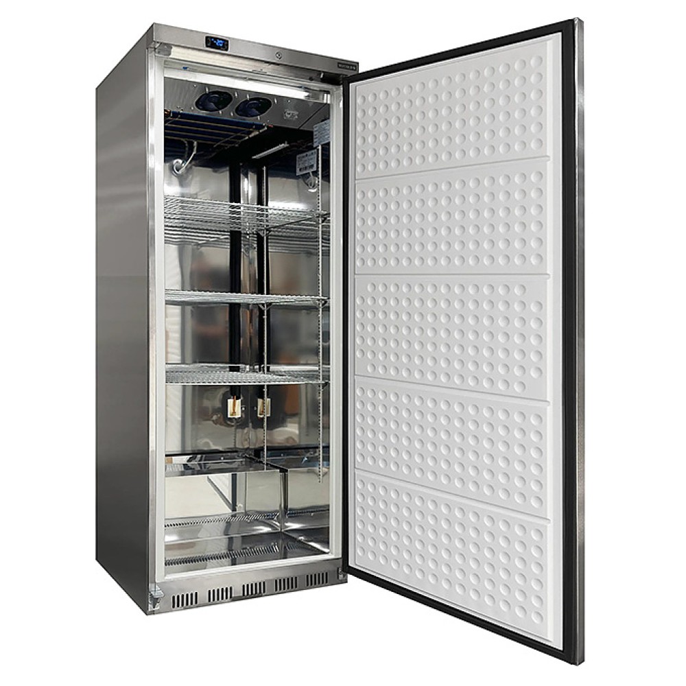 Морозильный шкаф TEFCOLD UF600SS предназначен для заморозки и длительного хранения продуктов на предприятиях общественного питания и торговли. Модель оснащена распашной глухой дверью, интегрированной в фасад ручкой, термометром, 3 регулируемыми решетчатыми полками, замком, 2 регулируемыми ножками и 2 роликами. Корпус выполнен из нержавеющей стали SS 430, внутренняя отделка - из нержавеющей стали SS 304.