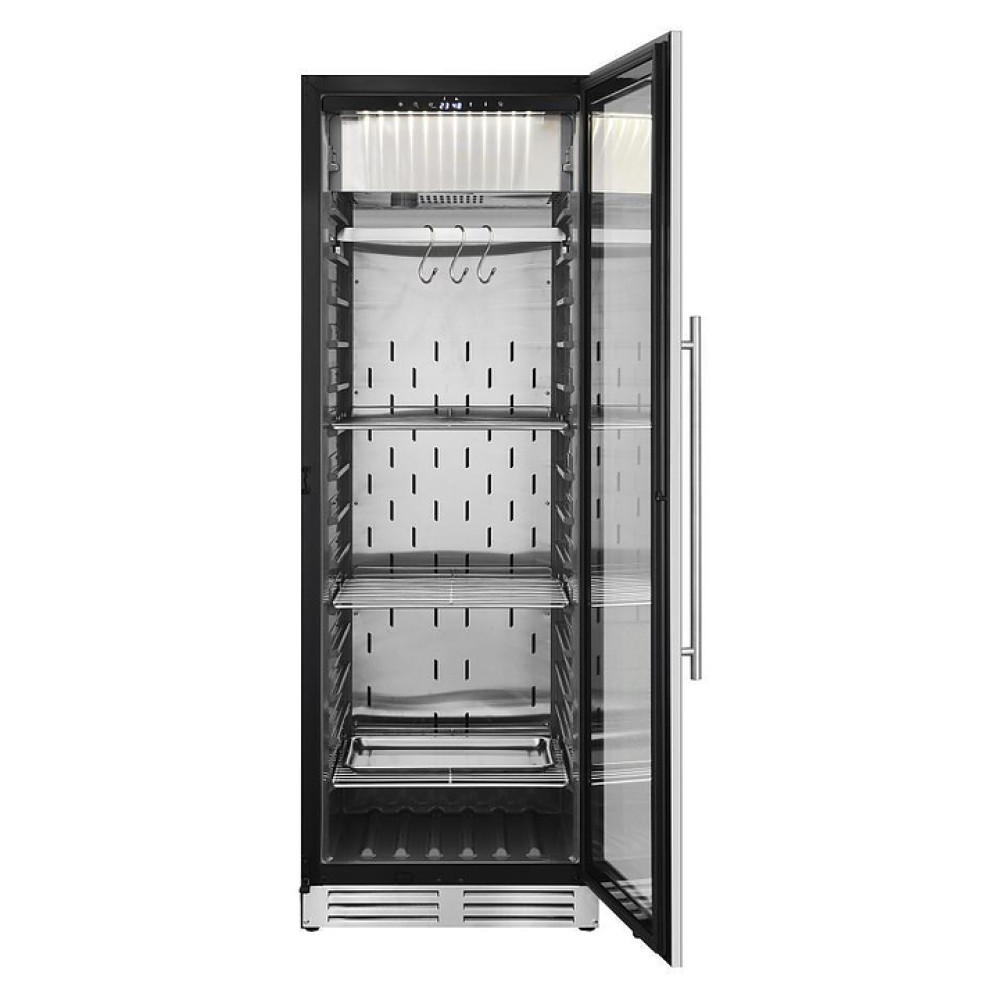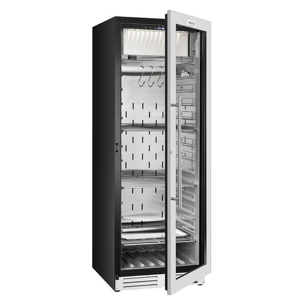 Шкаф для мяса MeatAge VI180 WT предназначен для охлаждения и вызревания мяса, ветчины и салями в частных домах, квартирах, отелях и офисах. Модель оснащена акустической сигнализацией и запираемой дверью. Корпус и комплектующие выполнены из нержавеющей стали AISI 304, дверца - из ударопрочного закаленного стекла.