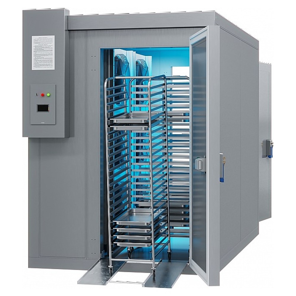 Камера шоковой заморозки POLAIR BCF 80.1.T4 используется на предприятиях общественного питания и торговли для быстрого охлаждения и заморозки свежих продуктов и полуфабрикатов, в том числе непосредственно после термической обработки, с сохранением их первоначальных свойств. Модель оснащена 2 запираемыми на ключ распашными дверьми на противоположных сторонах, электронным блоком управления с цифровым дисплеем и 2 светодиодными индикаторами. Внешняя облицовка сзндвич-панелей корпуса выполнена из оцинкованной стали с полимерным покрытием, внутренняя облицовка – из высококачественной нержавеющей стали.