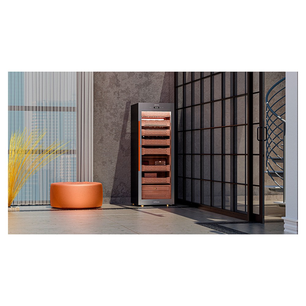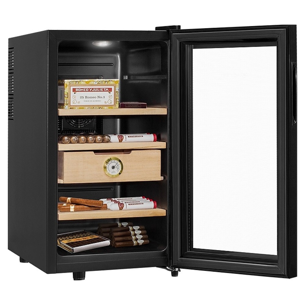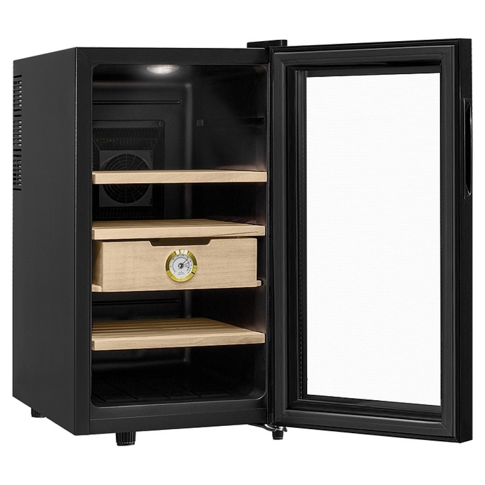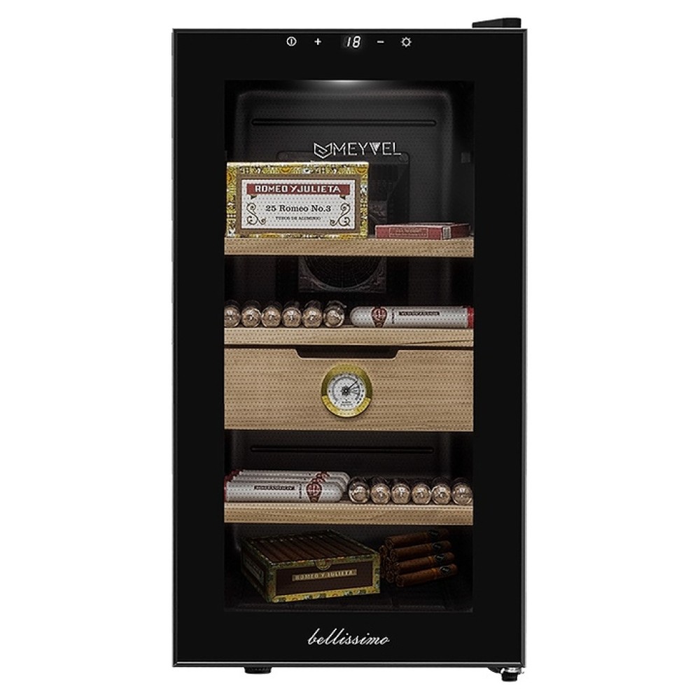 Сигарный шкаф MEYVEL MC-48BT предназначен для хранения в оптимальных условиях и демонстрации табачных изделий в специализированных магазинах, гостиницах, складских помещениях, а также домашних условиях. Модель оснащена распашной дверью на внешних петлях и сенсорной панелью управления с цифровым дисплеем. Копрус выполнен из стали с антикоррозийным покрытием черного цвета, рама двери – из черного пластика, полки и ящик – из массива древесины испанского кедра.