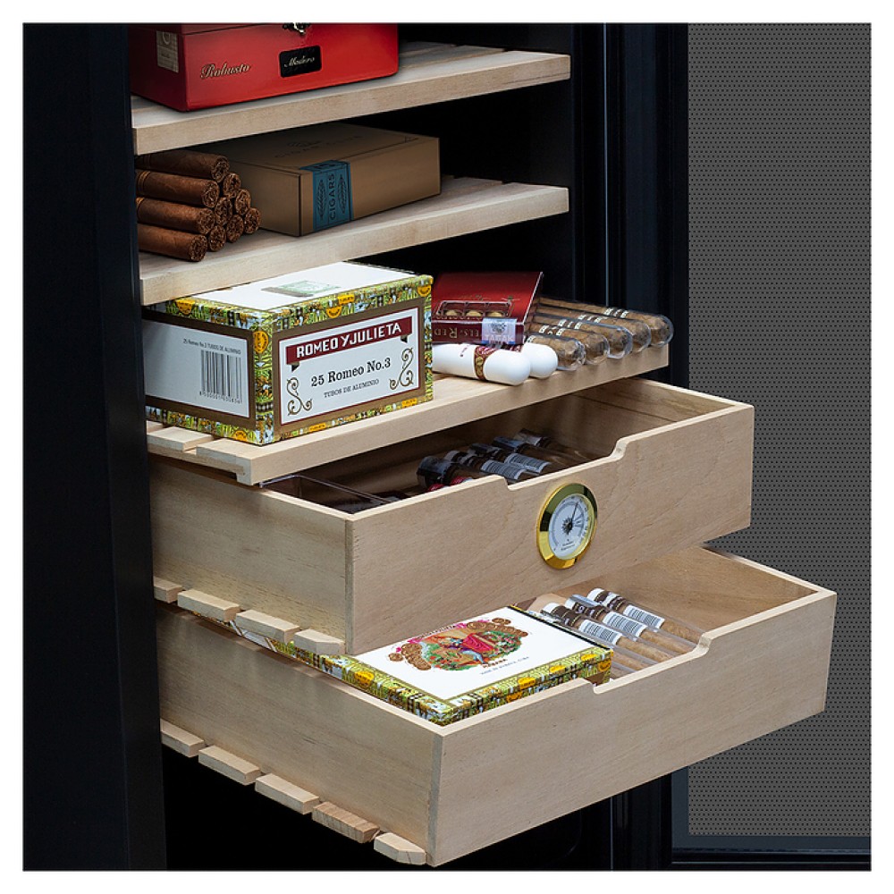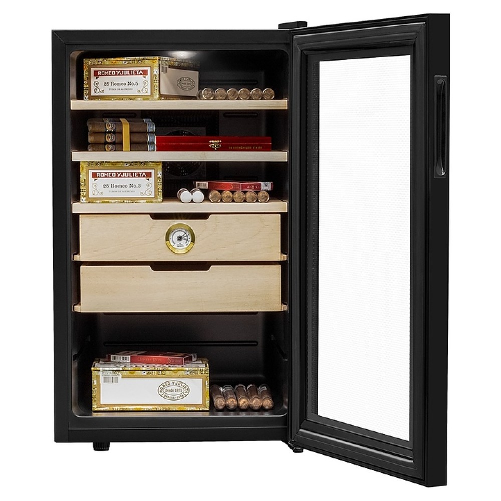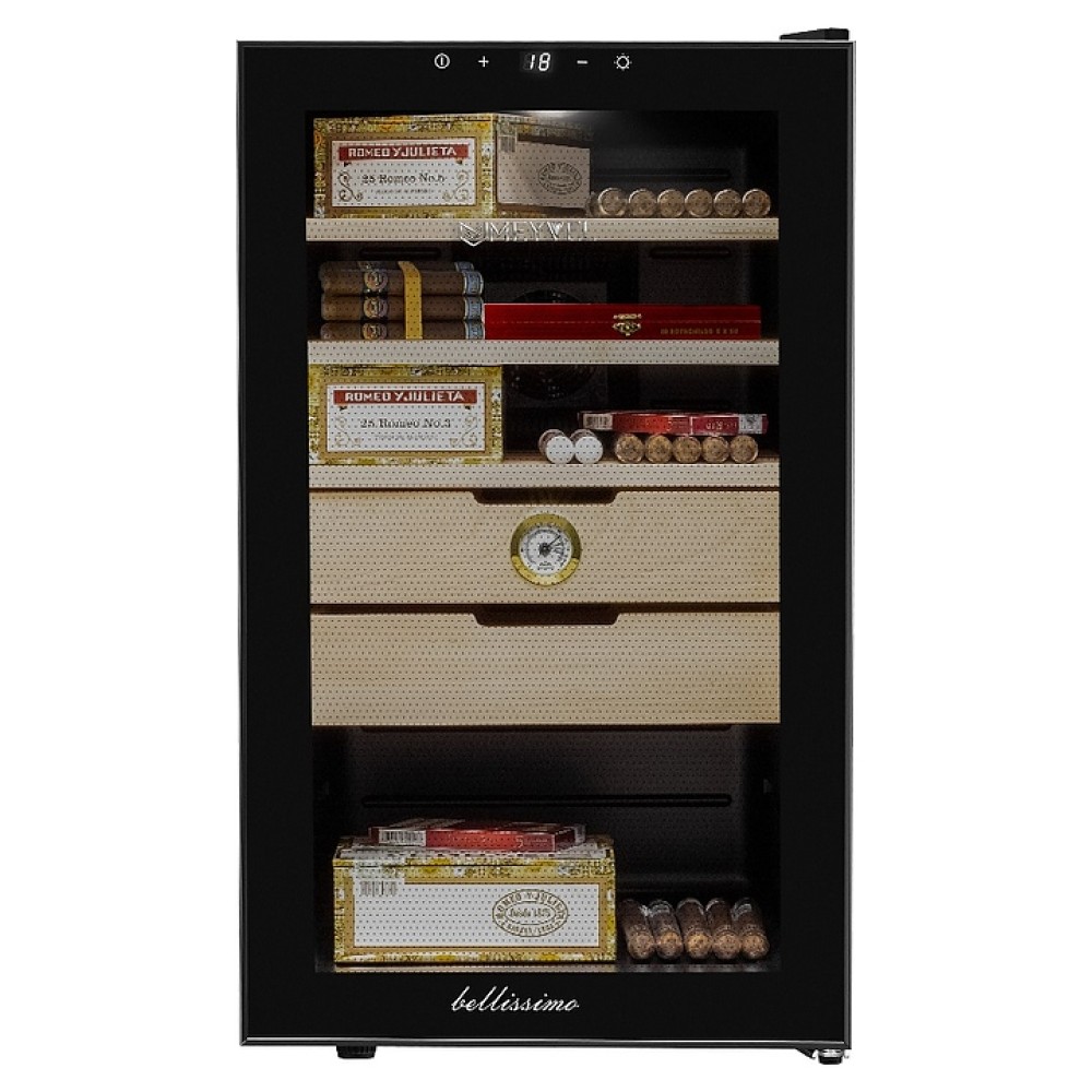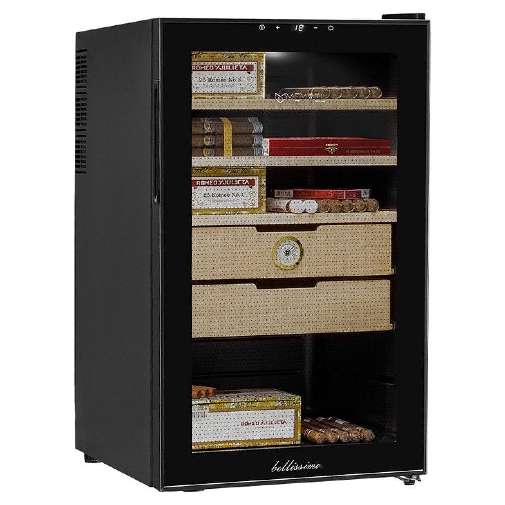 Сигарный шкаф MEYVEL MC-70BT предназначен для хранения в оптимальных условиях и демонстрации табачных изделий в специализированных магазинах, гостиницах, складских помещениях, а также домашних условиях. Модель оснащена распашной дверью на внешних петлях и сенсорной панелью управления с цифровым дисплеем. Копрус выполнен из стали с антикоррозийным покрытием черного цвета, рама двери – из черного пластика, полки и ящики – из массива древесины испанского кедра.