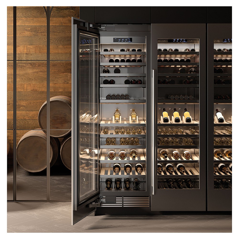 Винный шкаф SIGNATURE KITCHEN SUITE SKSCW242RP предназначен для демонстрации, хранения и создания оптимальных условий для сохранения всех вкусовых свойств вина в бутылках в частных домах и квартирах. Модель оснащена 3 температурными зонами, инверторным линейным компрессором, демпферным двигателем и освещением демонстрационных полок. Система принудительной циркуляции воздуха NoFrost препятствует осаждению на холодных поверхностях влаги с последующей ее кристаллизацией, что не требуют периодического размораживания. Система Smart Knock при двойном стуке по стеклу автоматически активирует подсветку внутри устройства, позволяет увидеть этикетки на бутылках, не открывая дверцу и сохраняя качество вина или энергоэффективность. Полки выполнены из натурального бука с металлическими элементами.