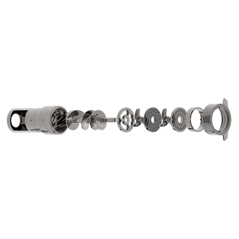 В комплект поставки входят подрезная решетка, 2 двусторонних ножа, 2 решетки с отверстиями (крупная и мелкая), подставка на колесах с тормозом, педаль, инструмент для удаления шнека и решеток, толкатель из пластика.