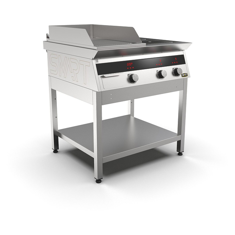 Комбинированная индукционная плита SMART INDUCTION K74-3RKN предназначена для приготовления и быстрого разогрева блюд на предприятиях общественного питания и торговли. Модель оснащена электронно-механической панелью управления с цифровой индикацией и сенсорными кнопками, 2 съемными жировыми фильтрами для отделения жира и влаги от поступающего внутрь аппарата воздуха, ящиком для сбора жира и регулируемыми по высоте ножками. Корпус и столешница выполнены из нержавеющей стали AISI430, рабочая поверхность плиты - из стеклокерамики, рабочая поверхность гриля и передняя панель - из нержавеющей стали.