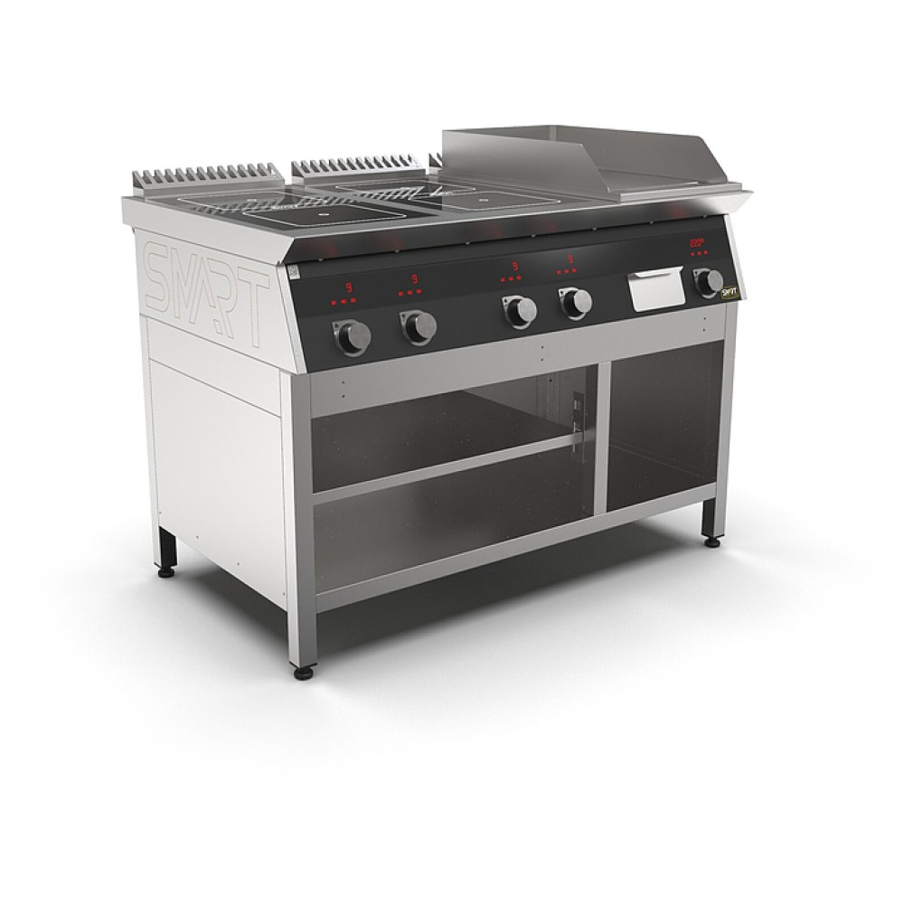 Комбинированная индукционная плита SMART INDUCTION K76-35KPB предназначена для приготовления и быстрого разогрева блюд на предприятиях общественного питания и торговли. Модель оснащена электронно-механической панелью управления с цифровой индикацией и сенсорными кнопками, 3 съемными жировыми фильтрами для отделения жира и влаги от поступающего внутрь аппарата воздуха, 2 ящиками для сбора жира и регулируемыми по высоте ножками. Корпус и столешница выполнены из нержавеющей стали AISI430, рабочая поверхность плиты - из стеклокерамики, рабочая поверхность гриля - из нержавеющей стали, передняя панель имеет стойкое полимерное покрытие черного цвета.