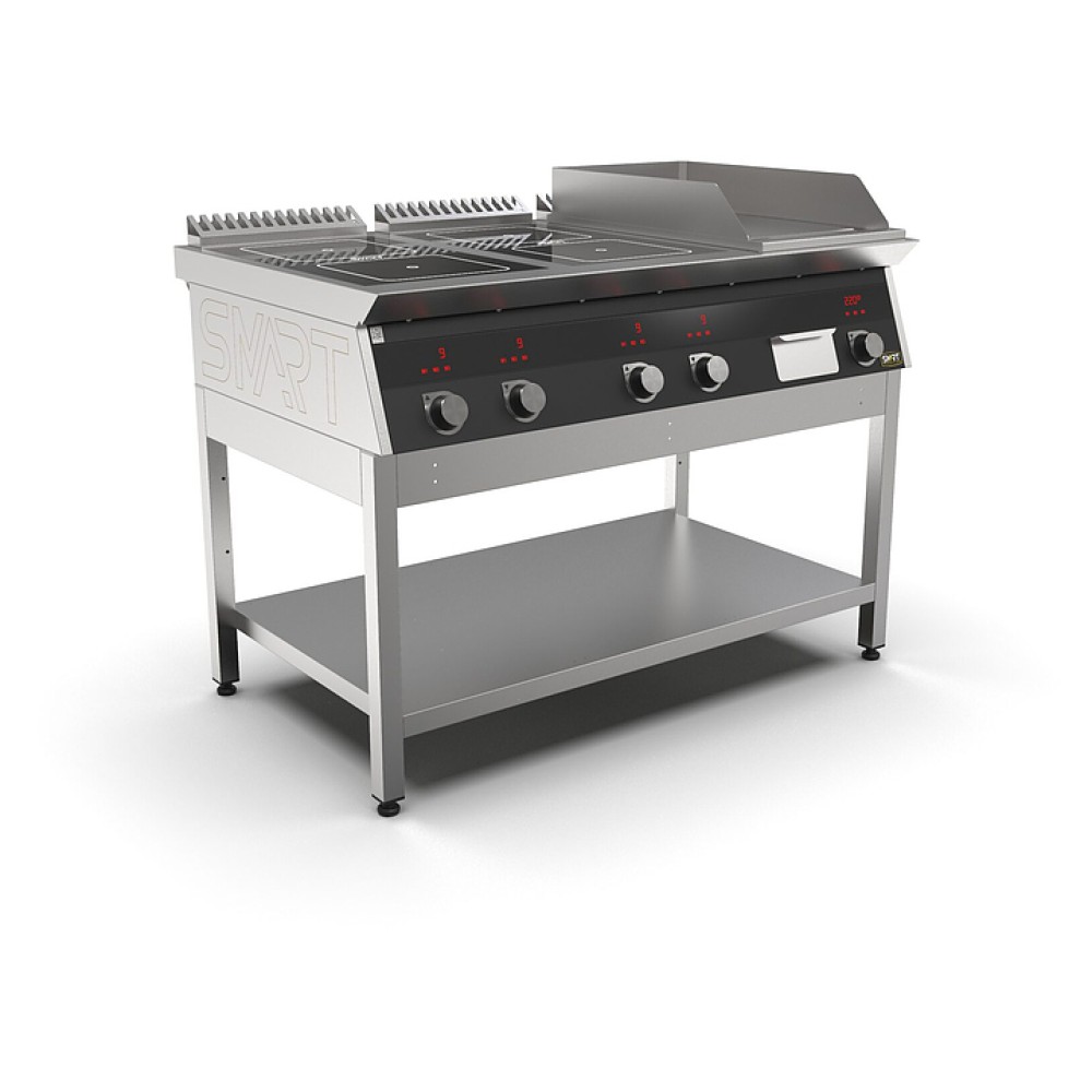Комбинированная индукционная плита SMART INDUCTION K76-3KPB предназначена для приготовления и быстрого разогрева блюд на предприятиях общественного питания и торговли. Модель оснащена электронно-механической панелью управления с цифровой индикацией и сенсорными кнопками, 3 съемными жировыми фильтрами для отделения жира и влаги от поступающего внутрь аппарата воздуха, 2 ящиками для сбора жира и регулируемыми по высоте ножками. Корпус и столешница выполнены из нержавеющей стали AISI430, рабочая поверхность плиты - из стеклокерамики, рабочая поверхность гриля - из нержавеющей стали, передняя панель имеет стойкое полимерное покрытие черного цвета.