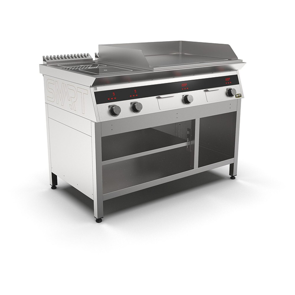 Комбинированная индукционная плита SMART INDUCTION K76-3KPPN предназначена для приготовления и быстрого разогрева блюд на предприятиях общественного питания и торговли. Модель оснащена электронно-механической панелью управления с цифровой индикацией и сенсорными кнопками, 3 съемными жировыми фильтрами для отделения жира и влаги от поступающего внутрь аппарата воздуха, 2 ящиками для сбора жира и регулируемыми по высоте ножками. Корпус и столешница выполнены из нержавеющей стали AISI430, рабочая поверхность плиты - из стеклокерамики, рабочая поверхность гриля и передняя панель - из нержавеющей стали.