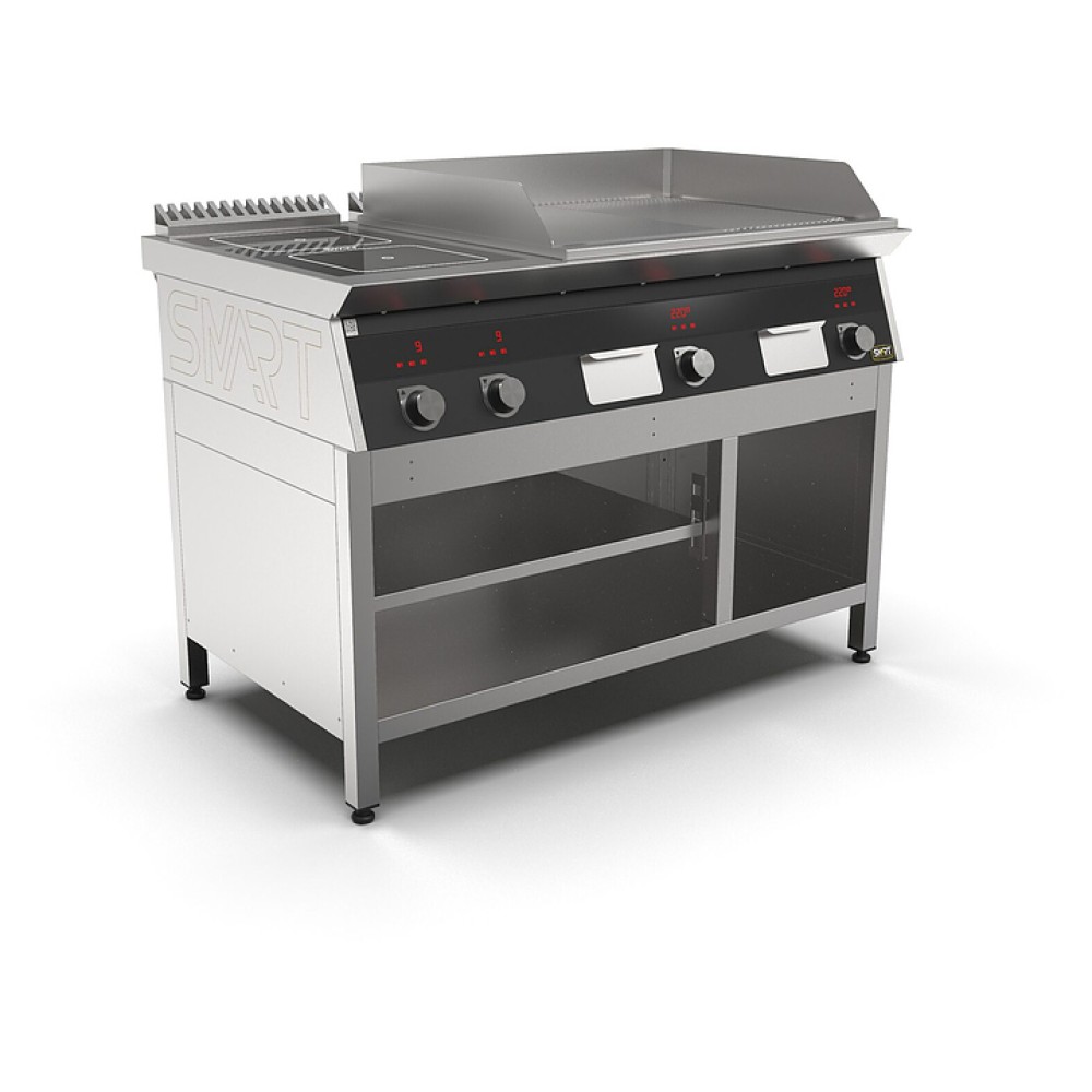 Комбинированная индукционная плита SMART INDUCTION K76-3KPRB предназначена для приготовления и быстрого разогрева блюд на предприятиях общественного питания и торговли. Модель оснащена электронно-механической панелью управления с цифровой индикацией и сенсорными кнопками, 3 съемными жировыми фильтрами для отделения жира и влаги от поступающего внутрь аппарата воздуха, 2 ящиками для сбора жира и регулируемыми по высоте ножками. Корпус и столешница выполнены из нержавеющей стали AISI430, рабочая поверхность плиты - из стеклокерамики, рабочая поверхность гриля - из нержавеющей стали, передняя панель имеет стойкое полимерное покрытие черного цвета.