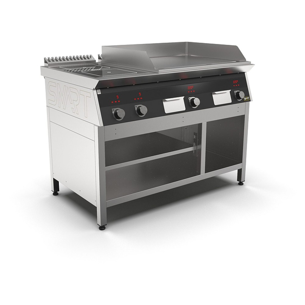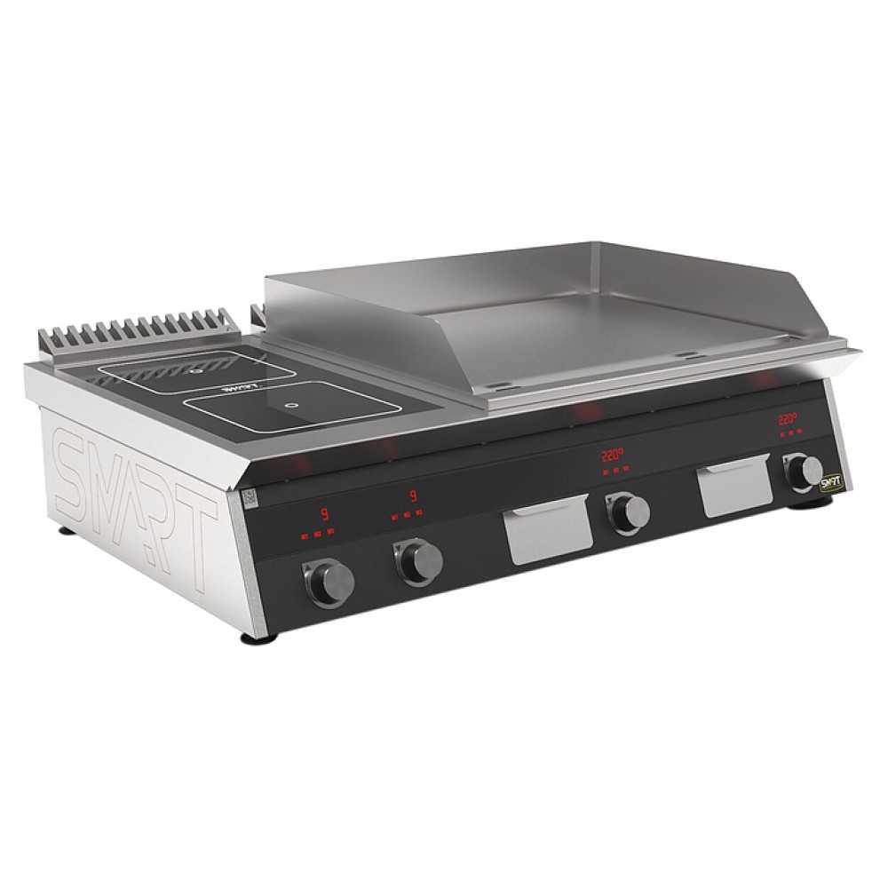 Комбинированная индукционная плита SMART INDUCTION K76-5KPPB предназначена для приготовления и быстрого разогрева блюд на предприятиях общественного питания и торговли. Модель оснащена электронно-механической панелью управления с цифровой индикацией и сенсорными кнопками, 3 съемными жировыми фильтрами для отделения жира и влаги от поступающего внутрь аппарата воздуха, 2 ящиками для сбора жира и регулируемыми по высоте ножками. Корпус и столешница выполнены из нержавеющей стали AISI430, рабочая поверхность плиты - из стеклокерамики, рабочая поверхность гриля - из нержавеющей стали, передняя панель имеет стойкое полимерное покрытие черного цвета.