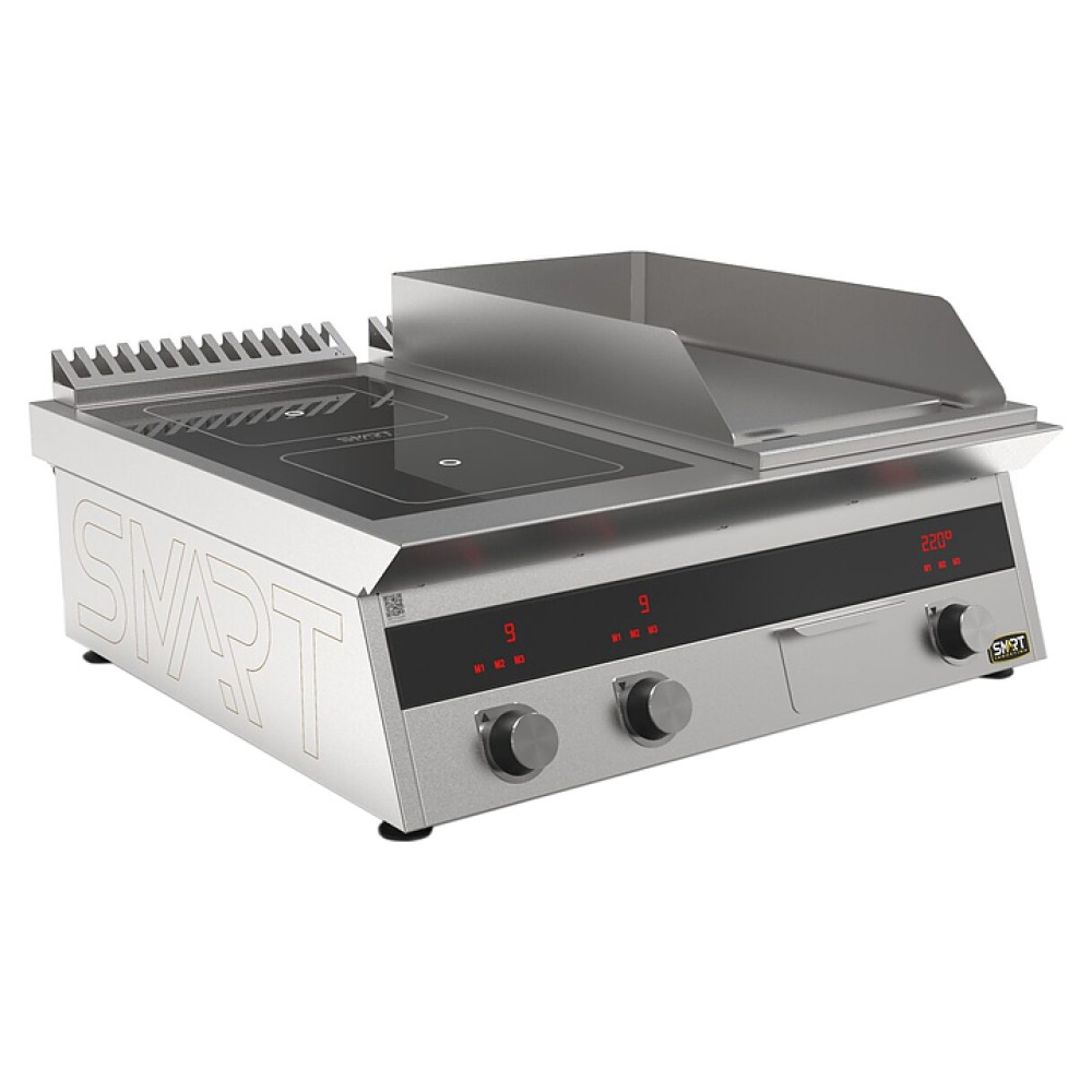 Комбинированная индукционная плита SMART INDUCTION K94-35KPN предназначена для приготовления и быстрого разогрева блюд на предприятиях общественного питания и торговли. Модель оснащена электронно-механической панелью управления с цифровой индикацией и сенсорными кнопками, 2 съемными жировыми фильтрами для отделения жира и влаги от поступающего внутрь аппарата воздуха, ящиком для сбора жира и регулируемыми по высоте ножками. Корпус и столешница выполнены из нержавеющей стали AISI430, рабочая поверхность плиты - из стеклокерамики, рабочая поверхность гриля и передняя панель - из нержавеющей стали.