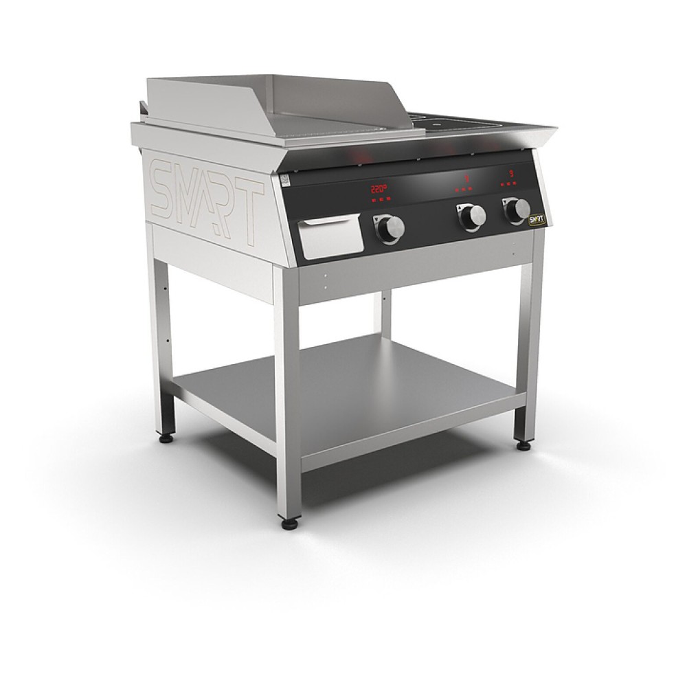 Комбинированная индукционная плита SMART INDUCTION K94-5RKB предназначена для приготовления и быстрого разогрева блюд на предприятиях общественного питания и торговли. Модель оснащена электронно-механической панелью управления с цифровой индикацией и сенсорными кнопками, 2 съемными жировыми фильтрами для отделения жира и влаги от поступающего внутрь аппарата воздуха, ящиком для сбора жира и регулируемыми по высоте ножками. Корпус и столешница выполнены из нержавеющей стали AISI430, рабочая поверхность плиты - из стеклокерамики, рабочая поверхность гриля - из нержавеющей стали, передняя панель имеет стойкое полимерное покрытие черного цвета.