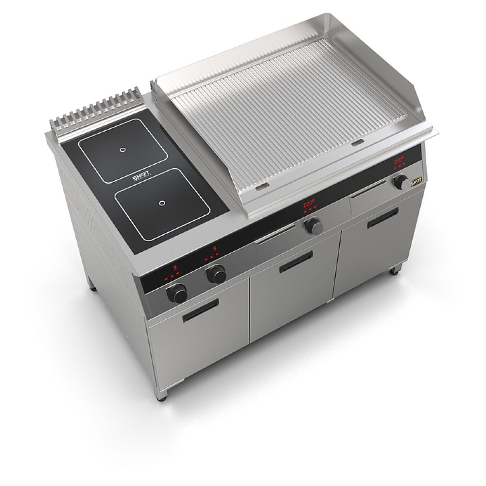 Комбинированная индукционная плита SMART INDUCTION K96-35KRRN предназначена для приготовления и быстрого разогрева блюд на предприятиях общественного питания и торговли. Модель оснащена электронно-механической панелью управления с цифровой индикацией и сенсорными кнопками, 3 съемными жировыми фильтрами для отделения жира и влаги от поступающего внутрь аппарата воздуха, 2 ящиками для сбора жира и регулируемыми по высоте ножками. Корпус и столешница выполнены из нержавеющей стали AISI430, рабочая поверхность плиты - из стеклокерамики, рабочая поверхность гриля и передняя панель - из нержавеющей стали.