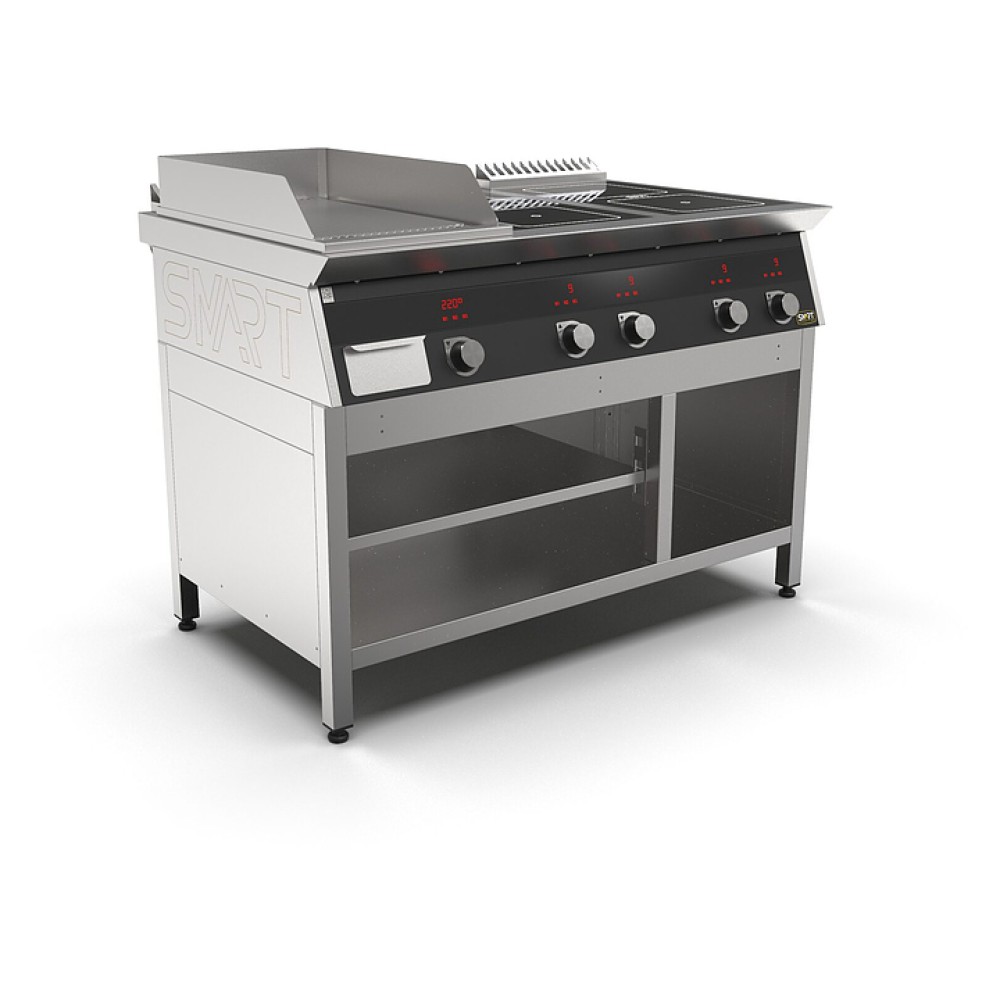 Комбинированная индукционная плита SMART INDUCTION K96-35RKB предназначена для приготовления и быстрого разогрева блюд на предприятиях общественного питания и торговли. Модель оснащена электронно-механической панелью управления с цифровой индикацией и сенсорными кнопками, 3 съемными жировыми фильтрами для отделения жира и влаги от поступающего внутрь аппарата воздуха, 2 ящиками для сбора жира и регулируемыми по высоте ножками. Корпус и столешница выполнены из нержавеющей стали AISI430, рабочая поверхность плиты - из стеклокерамики, рабочая поверхность гриля - из нержавеющей стали, передняя панель имеет стойкое полимерное покрытие черного цвета.