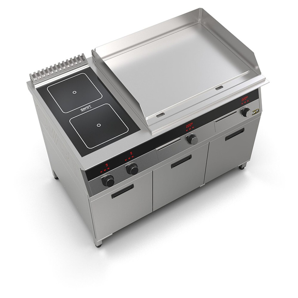 Комбинированная индукционная плита SMART INDUCTION K96-3KPPN предназначена для приготовления и быстрого разогрева блюд на предприятиях общественного питания и торговли. Модель оснащена электронно-механической панелью управления с цифровой индикацией и сенсорными кнопками, 3 съемными жировыми фильтрами для отделения жира и влаги от поступающего внутрь аппарата воздуха, 2 ящиками для сбора жира и регулируемыми по высоте ножками. Корпус и столешница выполнены из нержавеющей стали AISI430, рабочая поверхность плиты - из стеклокерамики, рабочая поверхность гриля и передняя панель - из нержавеющей стали.