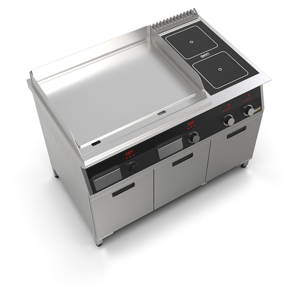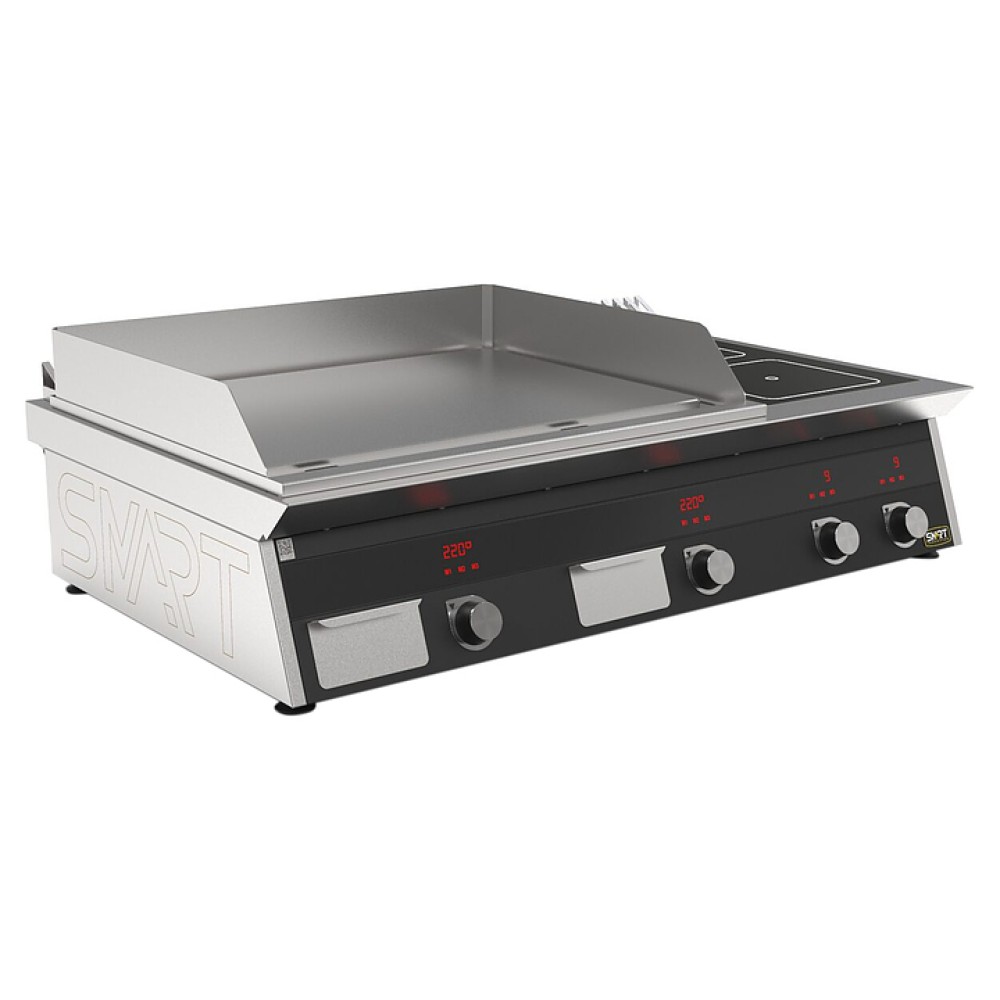 Комбинированная индукционная плита SMART INDUCTION K96-3PPKB предназначена для приготовления и быстрого разогрева блюд на предприятиях общественного питания и торговли. Модель оснащена электронно-механической панелью управления с цифровой индикацией и сенсорными кнопками, 3 съемными жировыми фильтрами для отделения жира и влаги от поступающего внутрь аппарата воздуха, 2 ящиками для сбора жира и регулируемыми по высоте ножками. Корпус и столешница выполнены из нержавеющей стали AISI430, рабочая поверхность плиты - из стеклокерамики, рабочая поверхность гриля - из нержавеющей стали, передняя панель имеет стойкое полимерное покрытие черного цвета.