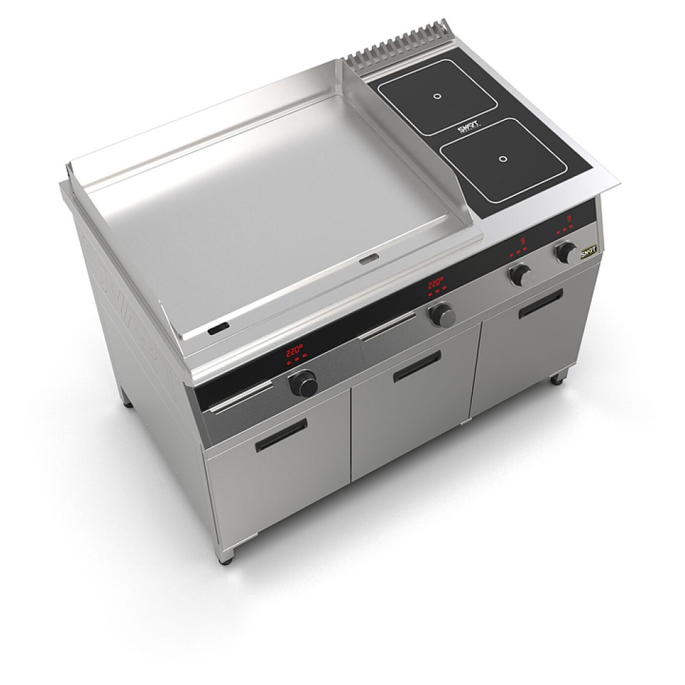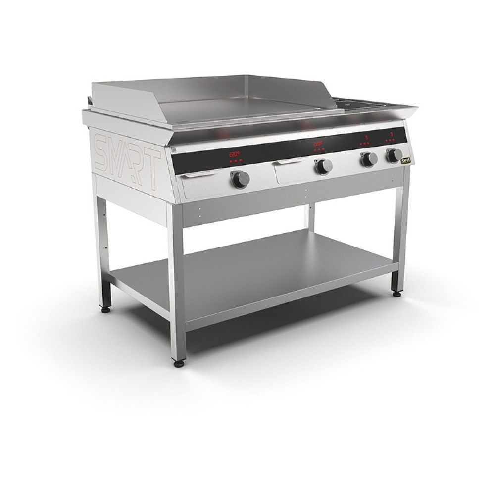 Комбинированная индукционная плита SMART INDUCTION K96-5PPKN предназначена для приготовления и быстрого разогрева блюд на предприятиях общественного питания и торговли. Модель оснащена электронно-механической панелью управления с цифровой индикацией и сенсорными кнопками, 3 съемными жировыми фильтрами для отделения жира и влаги от поступающего внутрь аппарата воздуха, 2 ящиками для сбора жира и регулируемыми по высоте ножками. Корпус и столешница выполнены из нержавеющей стали AISI430, рабочая поверхность плиты - из стеклокерамики, рабочая поверхность гриля и передняя панель - из нержавеющей стали.