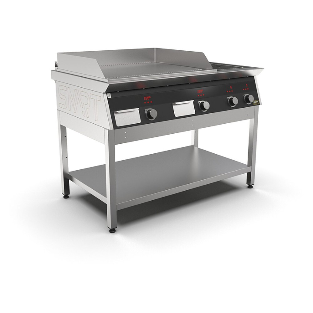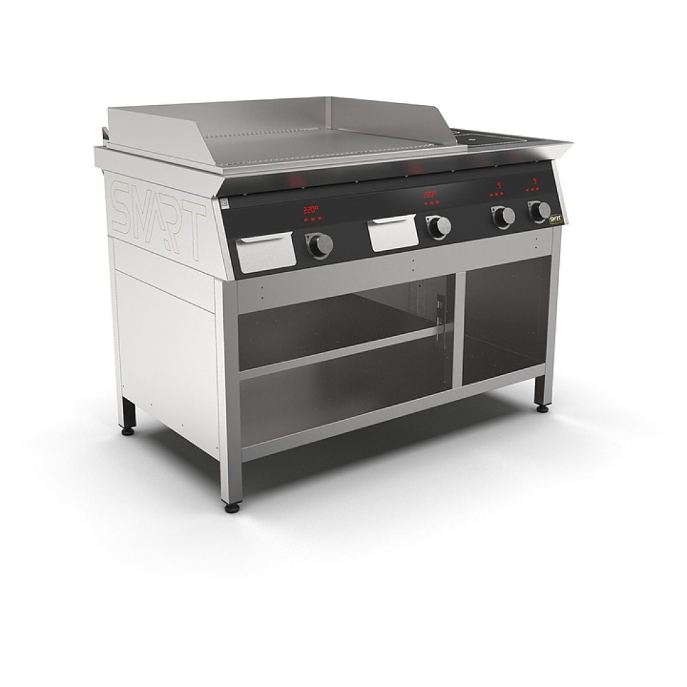 Комбинированная индукционная плита SMART INDUCTION K96-5RRKB предназначена для приготовления и быстрого разогрева блюд на предприятиях общественного питания и торговли. Модель оснащена электронно-механической панелью управления с цифровой индикацией и сенсорными кнопками, 3 съемными жировыми фильтрами для отделения жира и влаги от поступающего внутрь аппарата воздуха, 2 ящиками для сбора жира и регулируемыми по высоте ножками. Корпус и столешница выполнены из нержавеющей стали AISI430, рабочая поверхность плиты - из стеклокерамики, рабочая поверхность гриля - из нержавеющей стали, передняя панель имеет стойкое полимерное покрытие черного цвета.