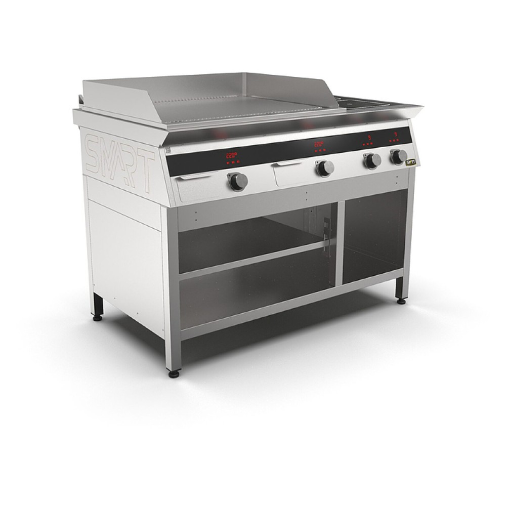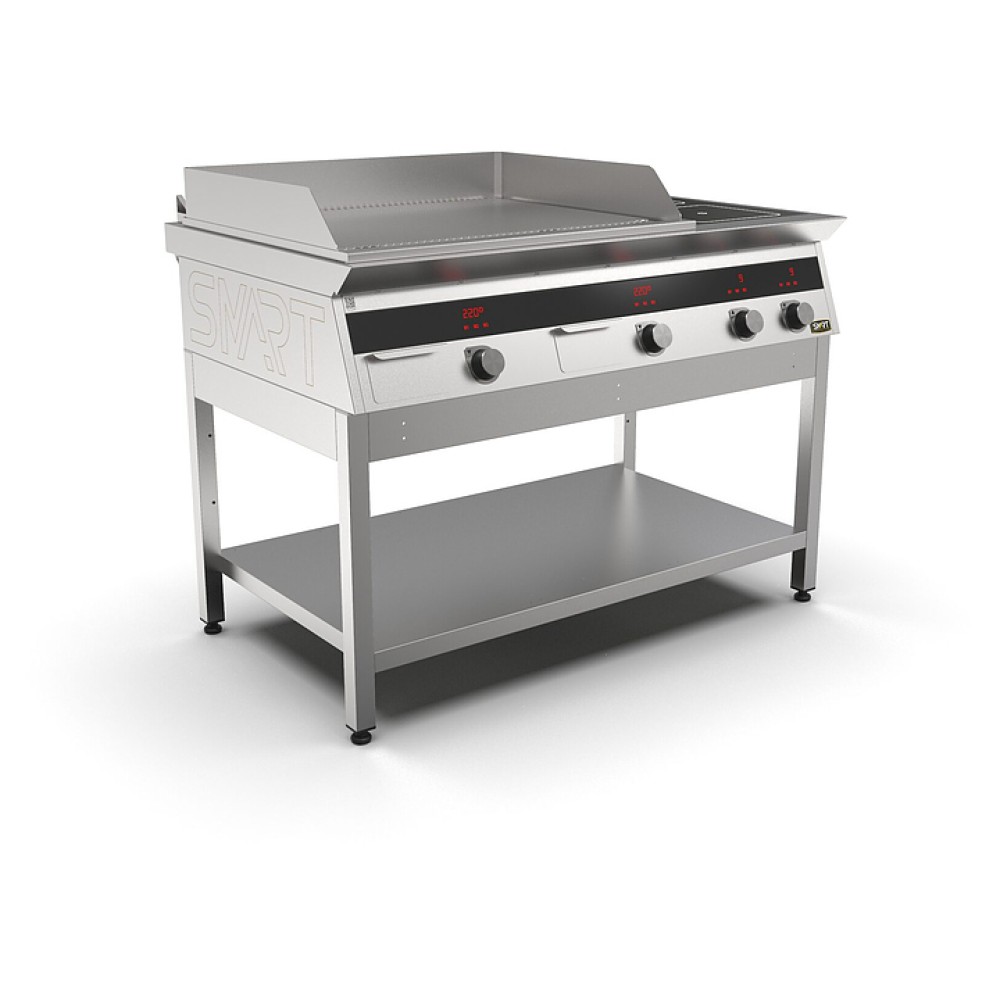 Комбинированная индукционная плита SMART INDUCTION K96-5RRKN предназначена для приготовления и быстрого разогрева блюд на предприятиях общественного питания и торговли. Модель оснащена электронно-механической панелью управления с цифровой индикацией и сенсорными кнопками, 3 съемными жировыми фильтрами для отделения жира и влаги от поступающего внутрь аппарата воздуха, 2 ящиками для сбора жира и регулируемыми по высоте ножками. Корпус и столешница выполнены из нержавеющей стали AISI430, рабочая поверхность плиты - из стеклокерамики, рабочая поверхность гриля и передняя панель - из нержавеющей стали.