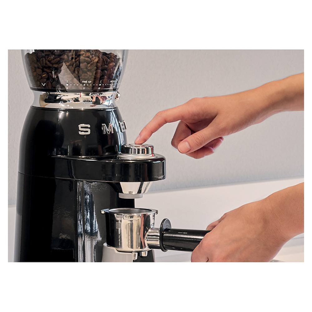 Кофемолка SMEG CGF11BLEU предназначена для приготовления молотого кофе из зерен в гостиницах, офисах и домашних условиях. Модель оснащена интегрированной подставкой для емкости с готовым продуктом, кабелем питания с вилкой и электромеханическим управлением. Корпус выполнен из нержавеющей стали с глянцевым внешним покрытием черного цвета и накладными объемными серебристыми литерами логотипа, жернова – из нержавеющей стали, рукоятка рычага – из стали SUS304 с серебристой поверхностью, основание, регулировочная ручка, крышка контейнера – из пластика с хромированной поверхностью, бункер и контейнер – из высокопрочного полимера Tritan Renew без содержания вредных компонентов, крышка бункера, подставка для холдера (держателя фильтра) и щетка – из пластика, изоляция кабеля серого цвета.