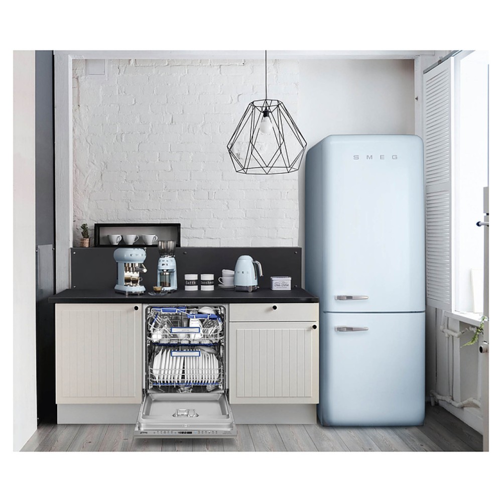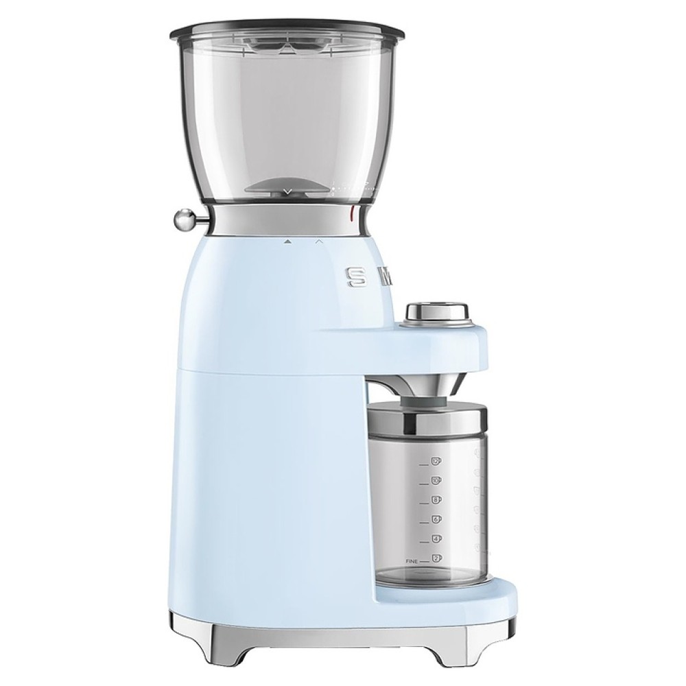 Электрическая кофемолка SMEG CGF11PBEU предназначена для приготовления молотого кофе из зерен в гостиницах, офисах и домашних условиях. Модель оснащена интегрированной подставкой для емкости с готовым продуктом, кабелем питания с вилкой и электромеханическим управлением. Корпус выполнен из нержавеющей стали с глянцевым внешним покрытием пастельного голубого оттенка и накладными объемными серебристыми литерами логотипа, жернова – из нержавеющей стали, рукоятка рычага – из стали SUS304 с серебристой поверхностью, основание, регулировочная ручка, крышка контейнера – из пластика с хромированной поверхностью, бункер и контейнер – из высокопрочного полимера Tritan Renew без содержания токсичных компонентов, крышка бункера, подставка для холдера (держателя фильтра) и щетка – из пластика, изоляция кабеля серого цвета.