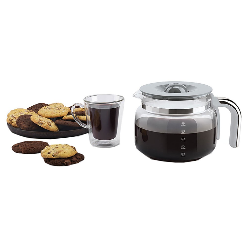 В комплект поставки входят стеклянный кувшин для кофе на 10 чашек с ручкой и крышкой, многоразовый фильтр с ручкой и мерная ложка для молотого кофе.