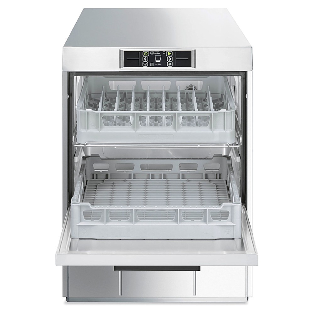 Посудомоечная машина с фронтальной загрузкой Smeg UD522DS серии Topline используется на предприятиях общественного питания и торговли для мойки столовых приборов, тарелок, стаканов, чашек и другой посуды. Модель оснащена электронной панелью управления. Корпус выполнен из нержавеющей стали AISI 304.