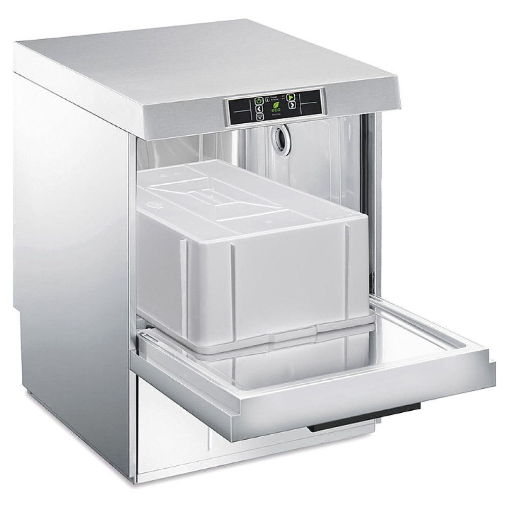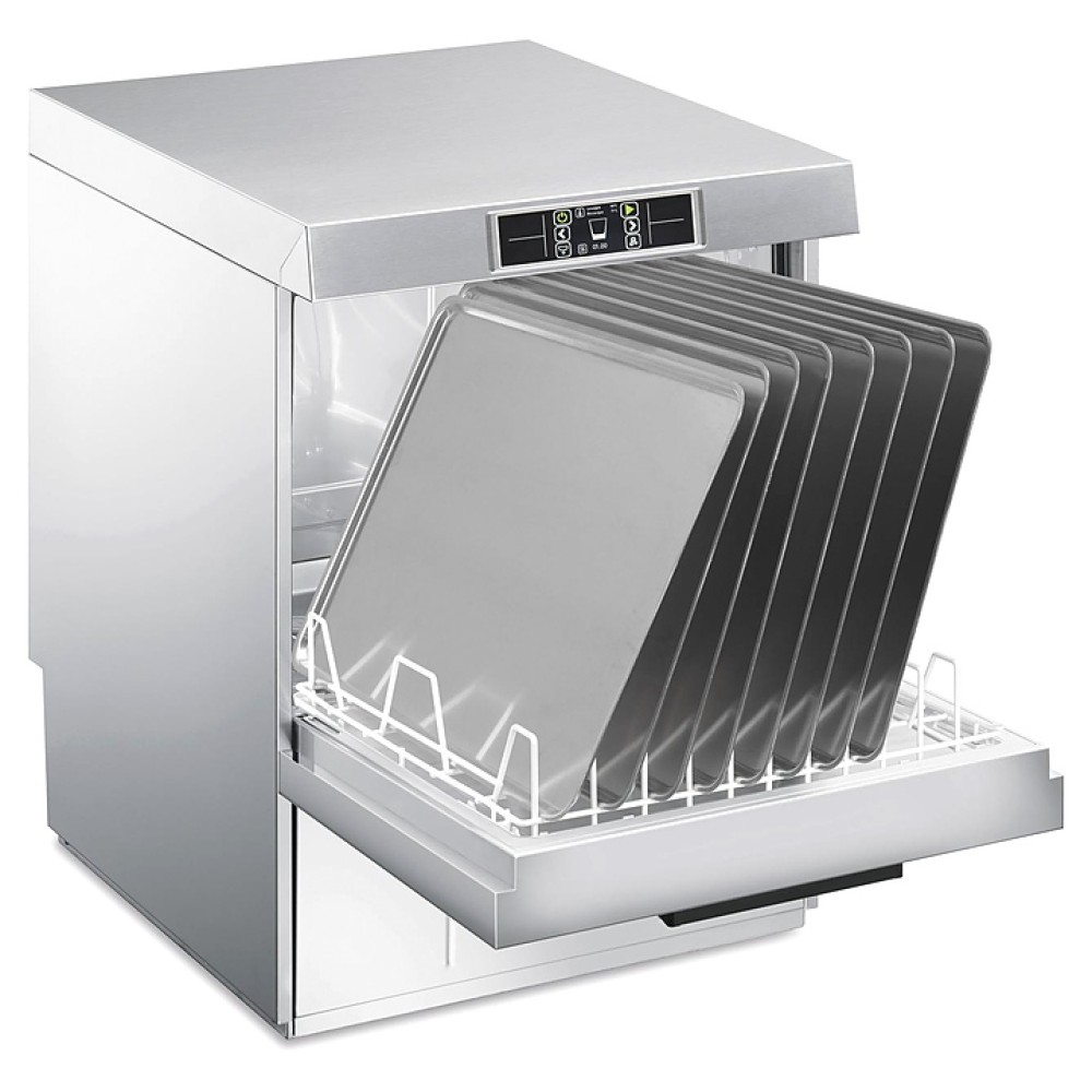 Посудомоечная машина с фронтальной загрузкой Smeg UD526DS серии Topline используется на предприятиях общественного питания и торговли для мойки столовых приборов, тарелок, стаканов, чашек и другой посуды. Модель оснащена электронной панелью управления. Корпус выполнен из нержавеющей стали AISI 304.
