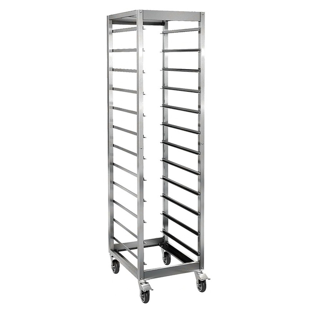 Тележка-шпилька Smeg SH12K6/4 с загрузкой по широкой стороне предназначена для транспортировки противней на предприятиях пищевой промышленности, общественного питания и торговли. Модель оснащена 4 колесами, 2 из которых с тормозами. Конструкция выполнена из нержавеющей стали.