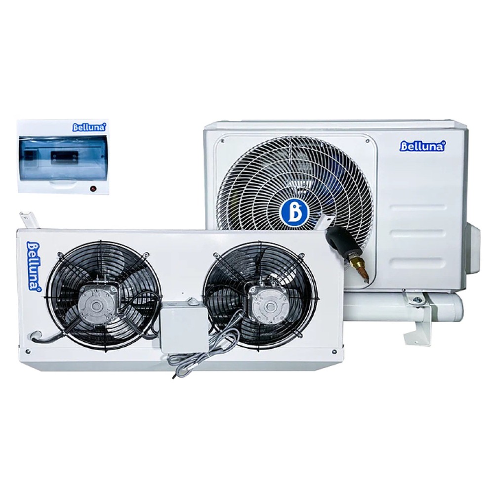 Холодильная универсальная сплит-система Belluna iP-3 предназначена для поддержания необходимого температурного режима в холодильных камерах на предприятиях пищевой промышленности, общественного питания и торговли. Инверторный компрессор с переменной производительностью от 30 до 100 % с отделителем жидкости позволяет поддерживать температуру с точностью до 0,5 °С, а также обеспечивает бесшумную работу. Холодильная машина состоит из наружного блока, внутреннего блока и щита управления. Для работы сплит-системы толщина пенополиуретановых панелей в холодильной камере должна быть не менее 80 мм.