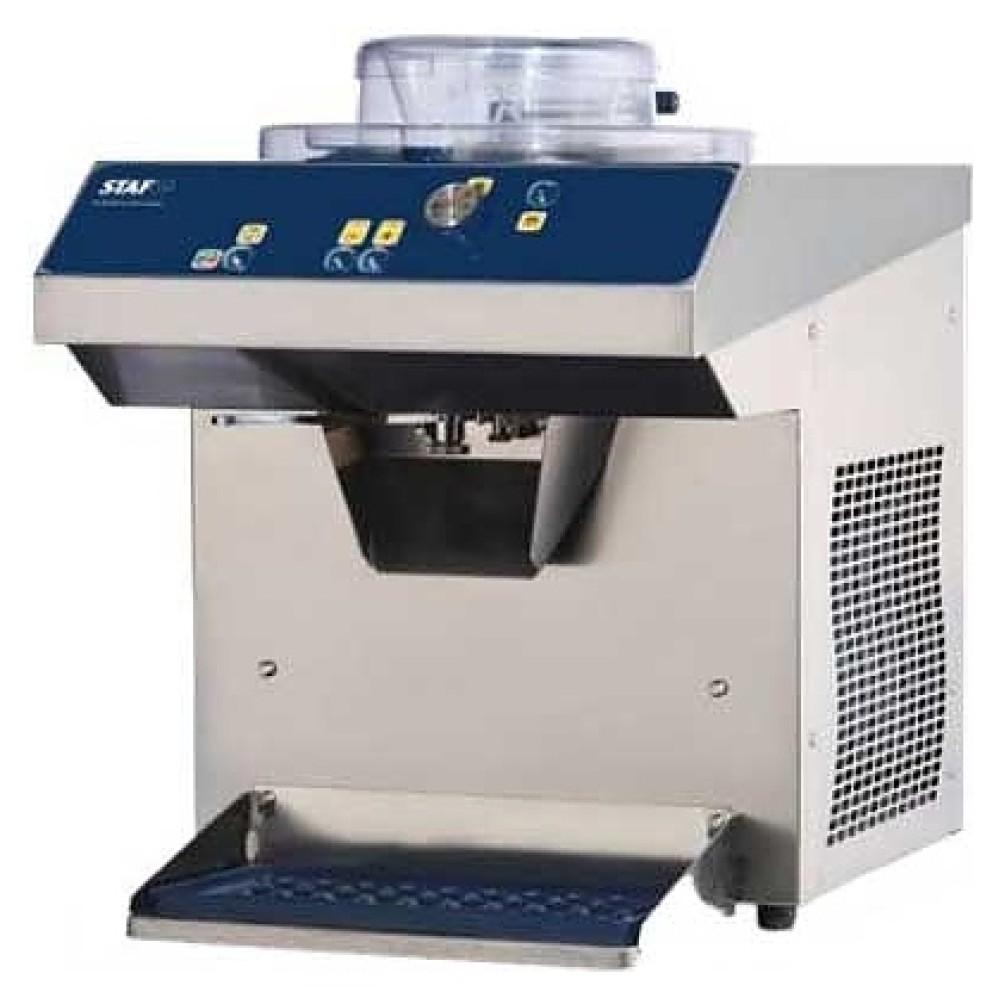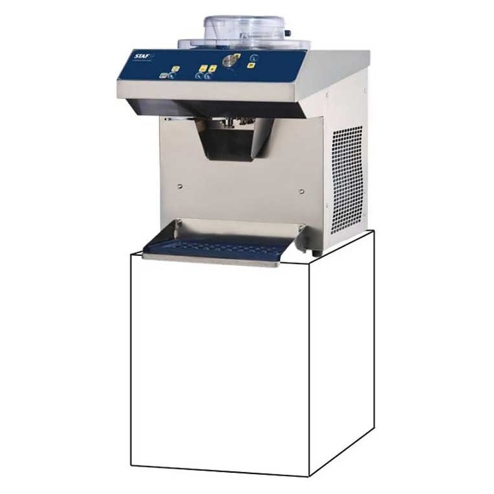 Настольный батч-фризер STAF59 BTE150 A используется в барах, кафе, на открытых летних площадках, в специальных отделах супермаркетов и торговых центрах для приготовления твердого мороженого и джелато. Модель оснащена прямым приводом с редукторами для снижения вибраций и колебаний, а также предотвращения проскальзывания, регулировки и замены ремней. Мешалка с 3 скоростями обеспечивает дозирование небольших объемов смеси с сохранением оптимальной структуры и облегчения операций экстракции и очистки. Двойная прозрачная крышка позволяет контролировать изменение смеси на протяжении всего этапа работы и гарантирует безопасную загрузку ингредиентов при работающей мешалке. Корпус и мешалка выполнены из нержавеющей стали, скребки - из полиэтилена.