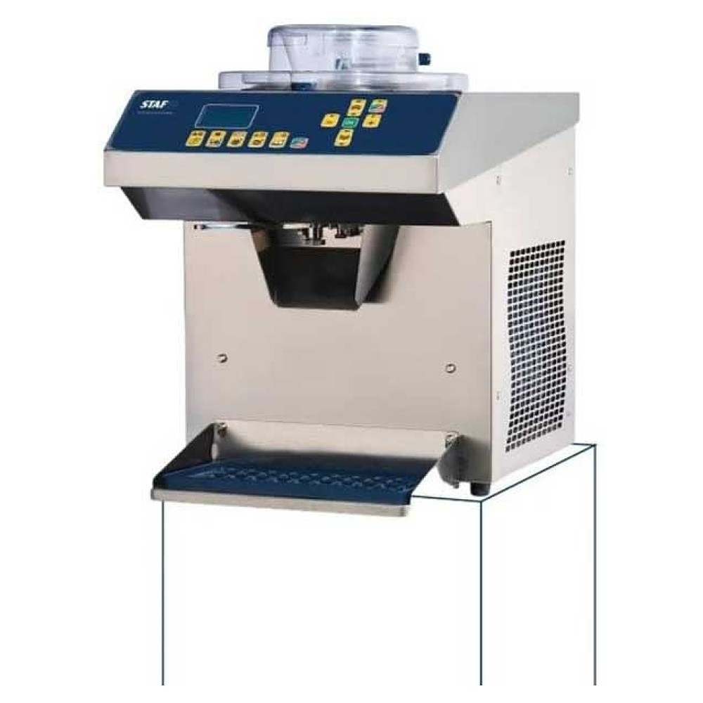 Настольный батч-фризер STAF59 BTX150 A используется в барах, кафе, на открытых летних площадках, в специальных отделах супермаркетов и торговых центрах для приготовления твердого мороженого и джелато. Модель оснащена прямым приводом с редукторами для снижения вибраций и колебаний, а также предотвращения проскальзывания, регулировки и замены ремней. Прозрачная двойная крышка позволяет контролировать трансформацию смеси на протяжении всего этапа работы и позволяет безопасно загрузить ингредиенты при работающей мешалке. Корпус и мешалка выполнены из нержавеющей стали, скребки - из полиэтилена.