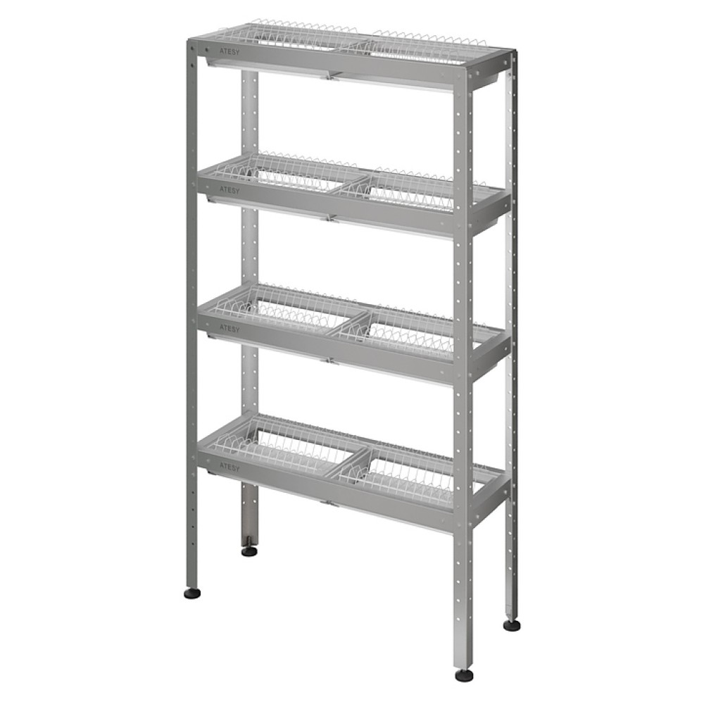 Кухонный стеллаж ATESY СКТ-Б-900-02 серии Бюджет предназначен для хранения тарелок на предприятиях общественного питания и торговли. Модель оснащена кассетами с лотками для сбора жидкости и регулируемыми по высоте опорами. Полки выполнены из нержавеющей стали AIS I430 толщиной 0,8 мм, стойки - из уголка оцинкованной стали толщиной 1,2 мм, съемные кассеты - из прутка крашеной стали толщиной 3 мм, ножки - из нержавеющей стали, основание ножек - из пластика.