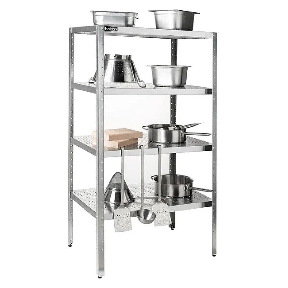 Стеллаж Кобор СКП-60/50/430 предназначен для хранения посуды, кухонной утвари и сухих продуктов на предприятиях общественного питания, торговли и в промышленно-производственных помещениях. Каркас выполнен в виде уголка 40х40 мм из нержавеющей стали, перфорированные полки - из нержавеющей стали AISI 430. Уникальная система крепления полок обеспечивает жёсткость конструкции стеллажа.